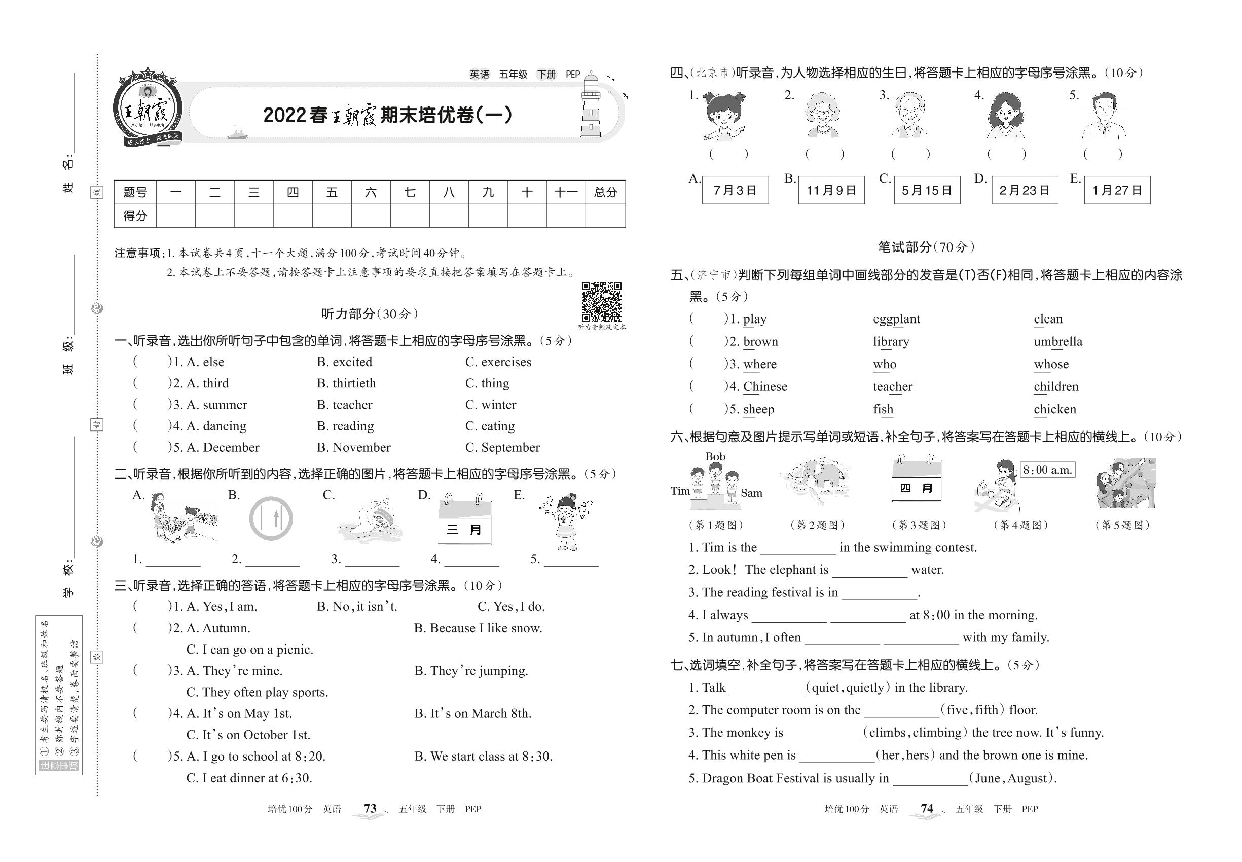 2022下册五年级英语人教PEP版 王朝霞期末培优卷(一)