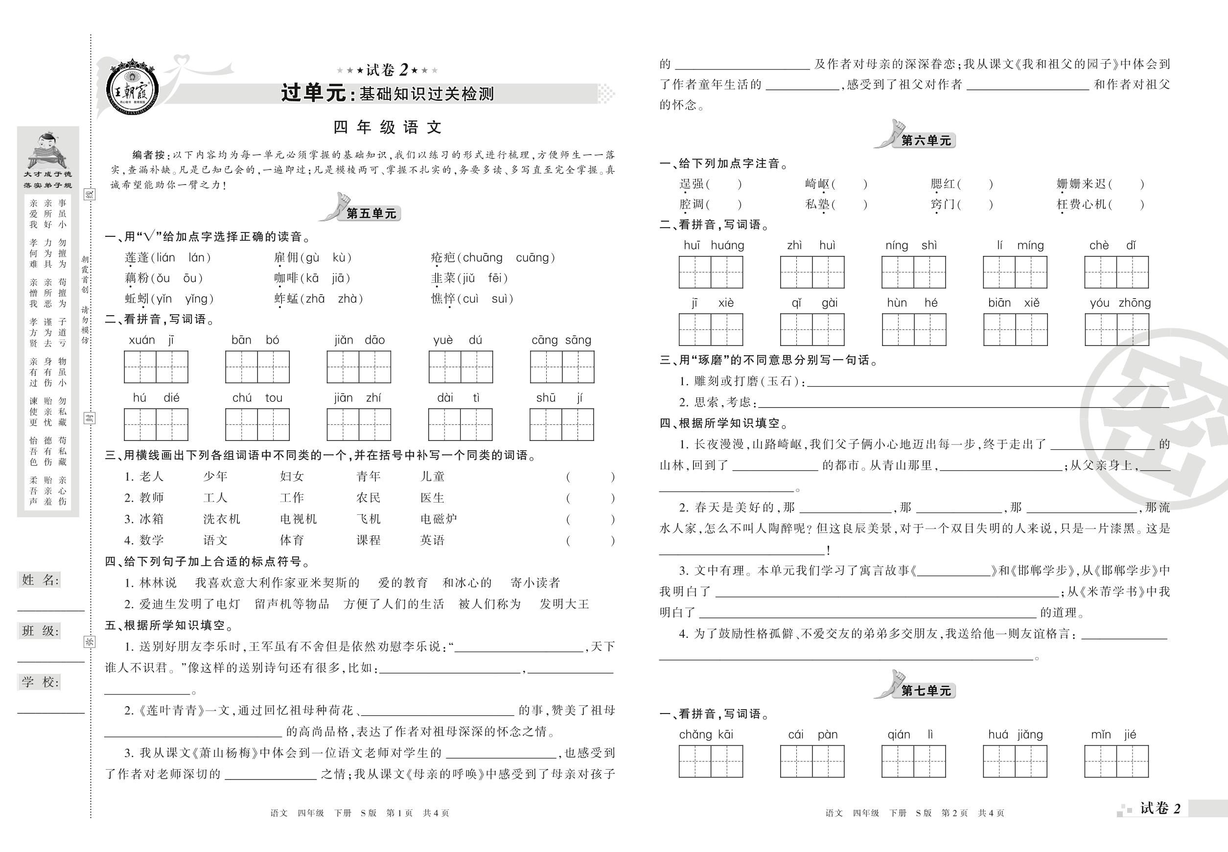 王朝霞期末过单元——基础知识过关检测四年级下册语文(S版)_R210801225516【2】