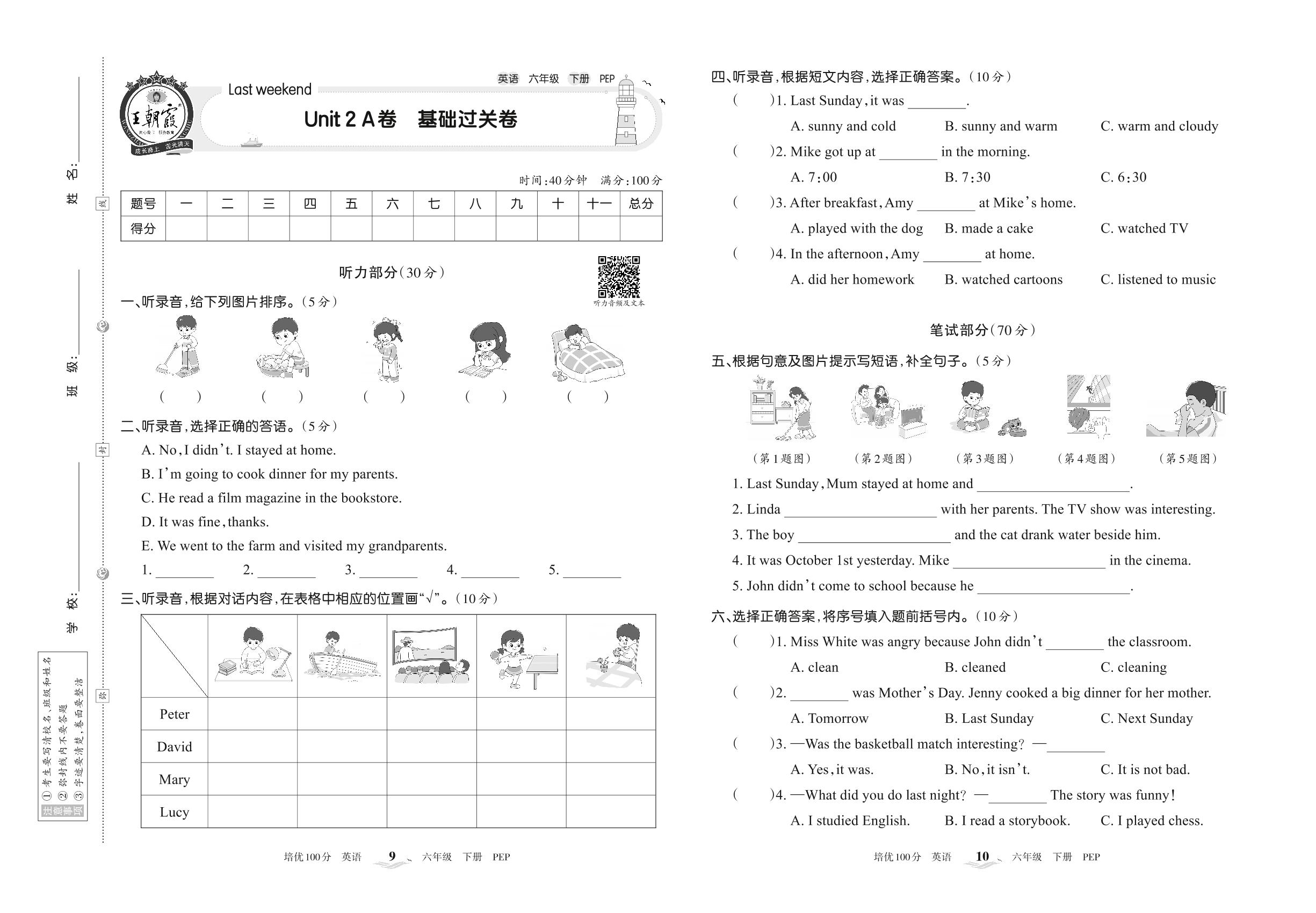 2022下册六年级英语人教PEP版 Unit 2 A卷 基础过关卷