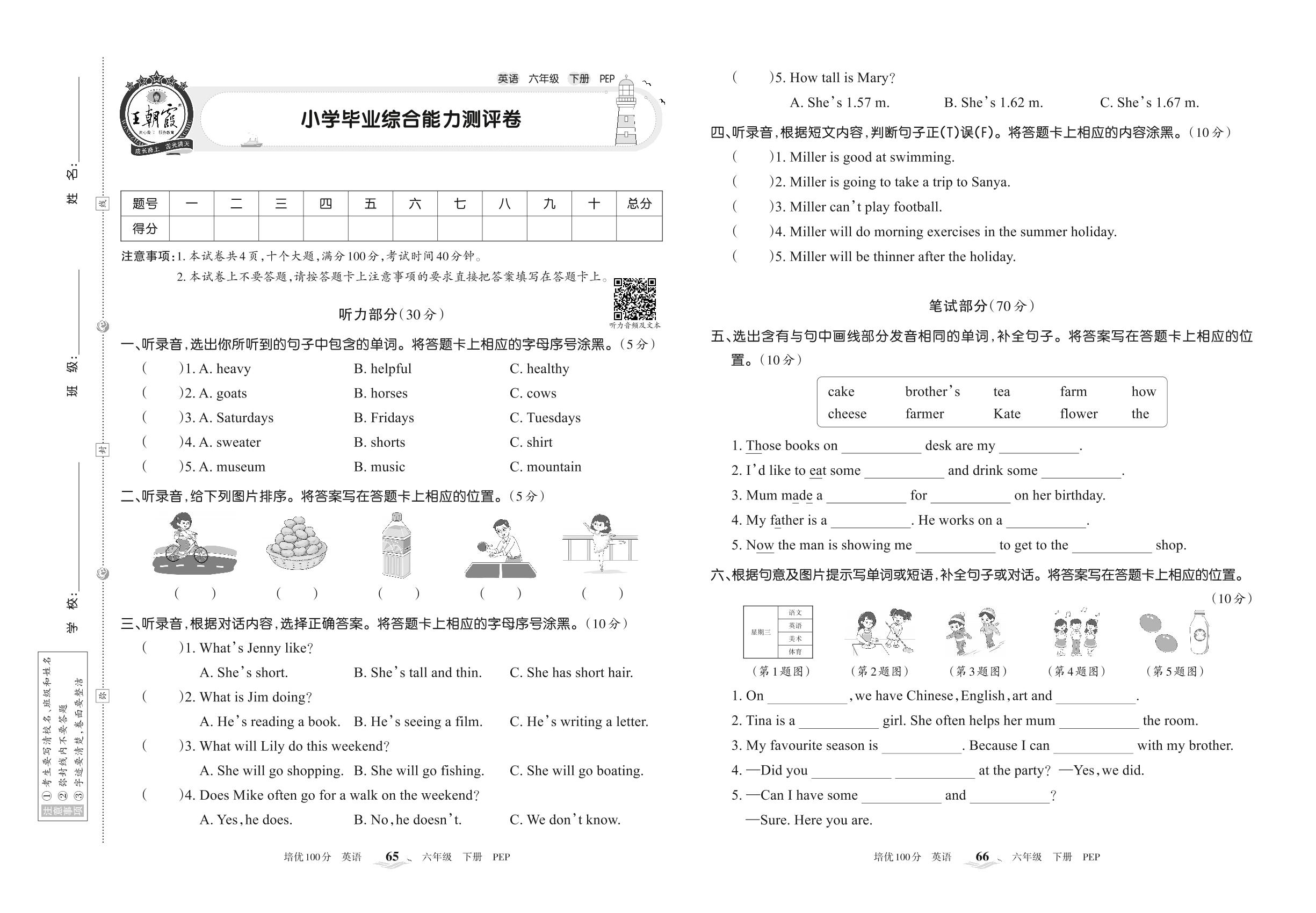 六年级英语人教PEP版(三起始)下册期末卷