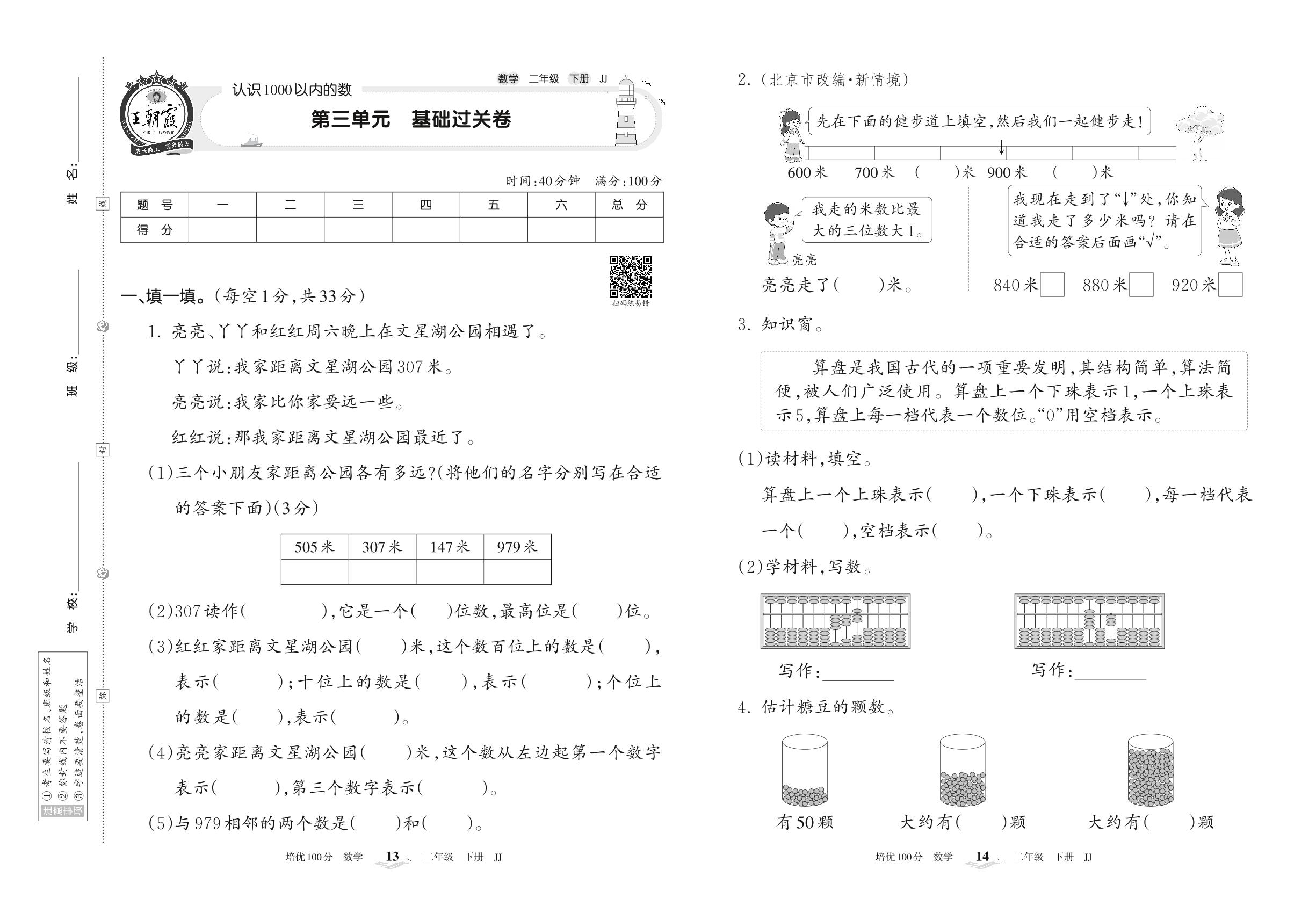 2022下册二年级数学冀教版 第三单元 基础过关卷