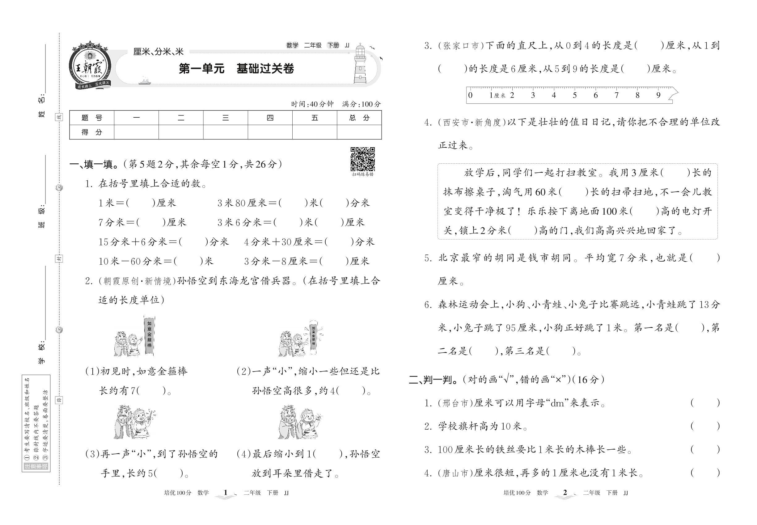 2022下册二年级数学冀教版 第一单元 基础过关卷