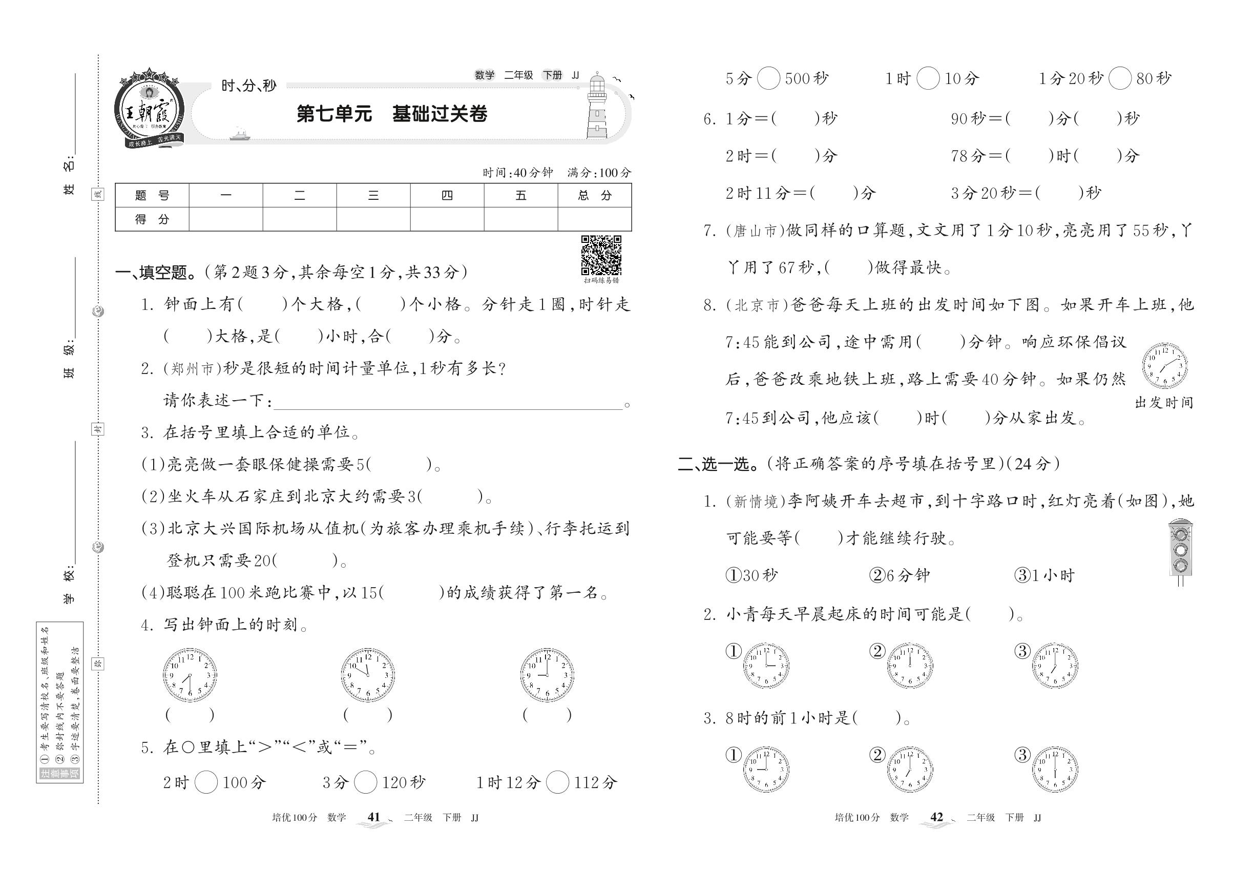 2022下册二年级数学冀教版 第七单元 基础过关卷