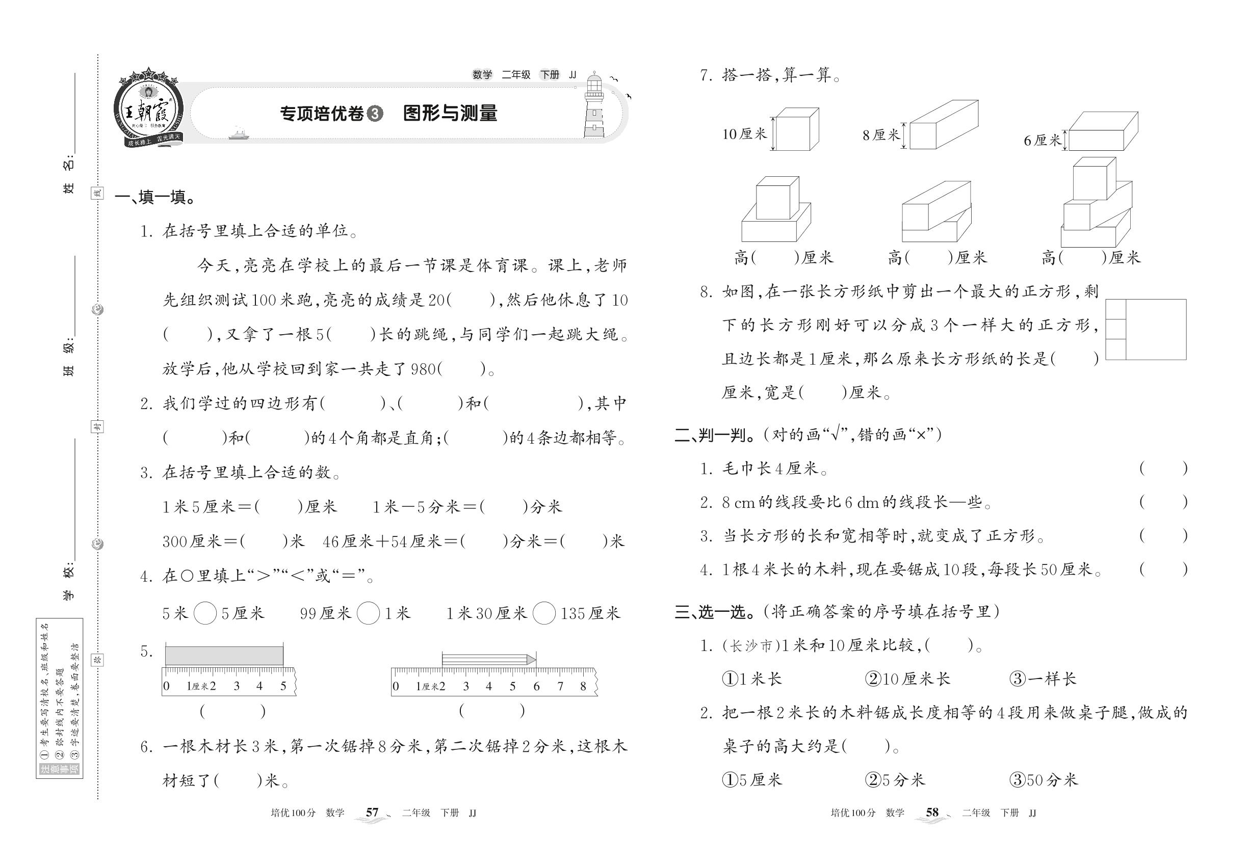 2022下册二年级数学冀教版 专项培优卷3 图形与测量
