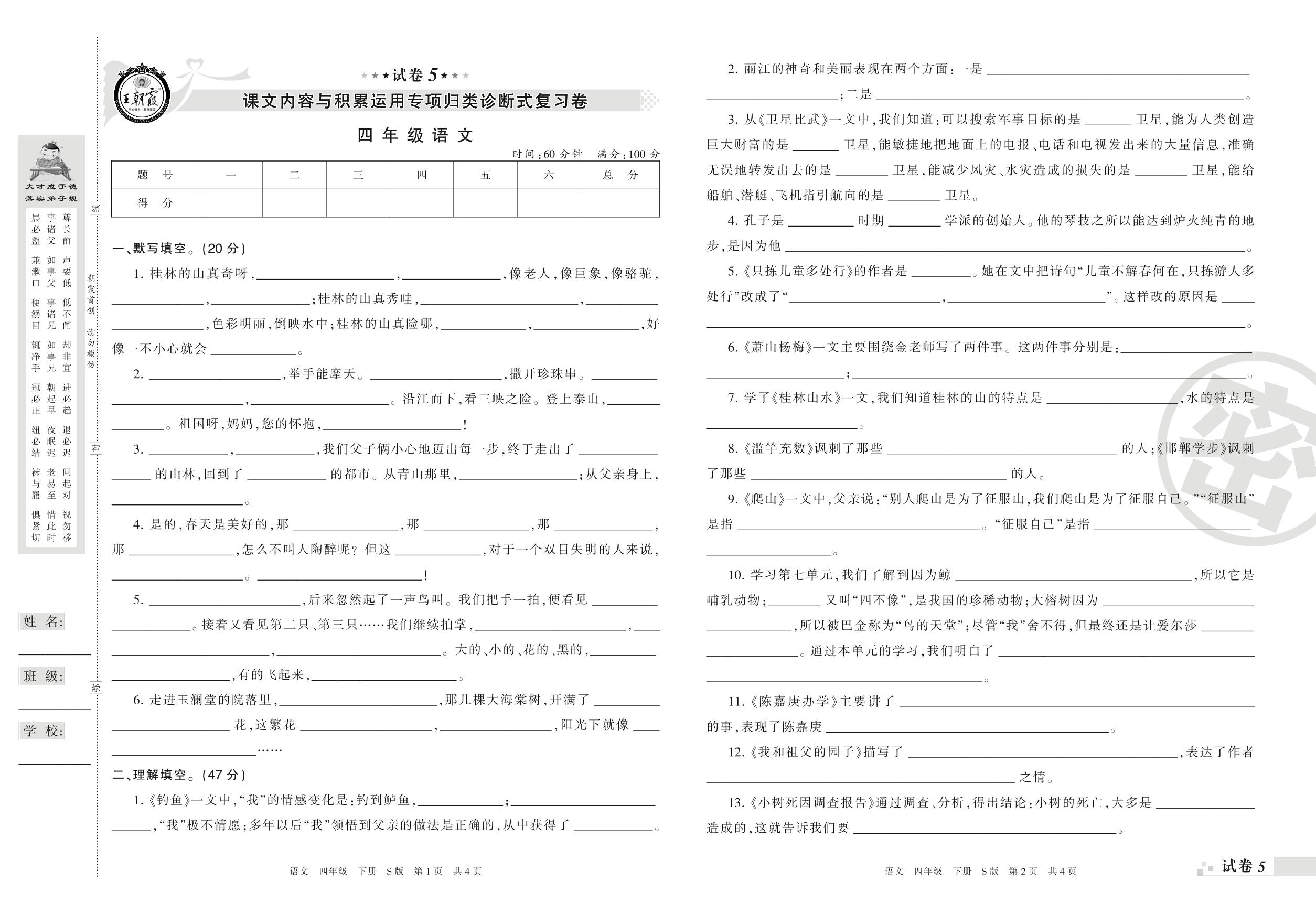 王朝霞期末专项卷——课文内容与积累运用专项归类诊断式复习卷四年级下册语文(S版)_R210801225524【5】