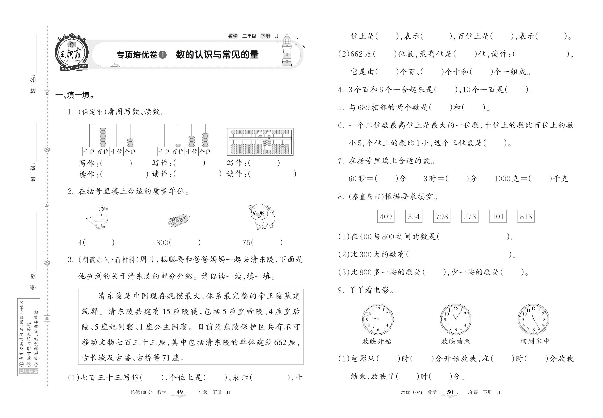 2022下册二年级数学冀教版 专项培优卷1 数的认识与常见的量