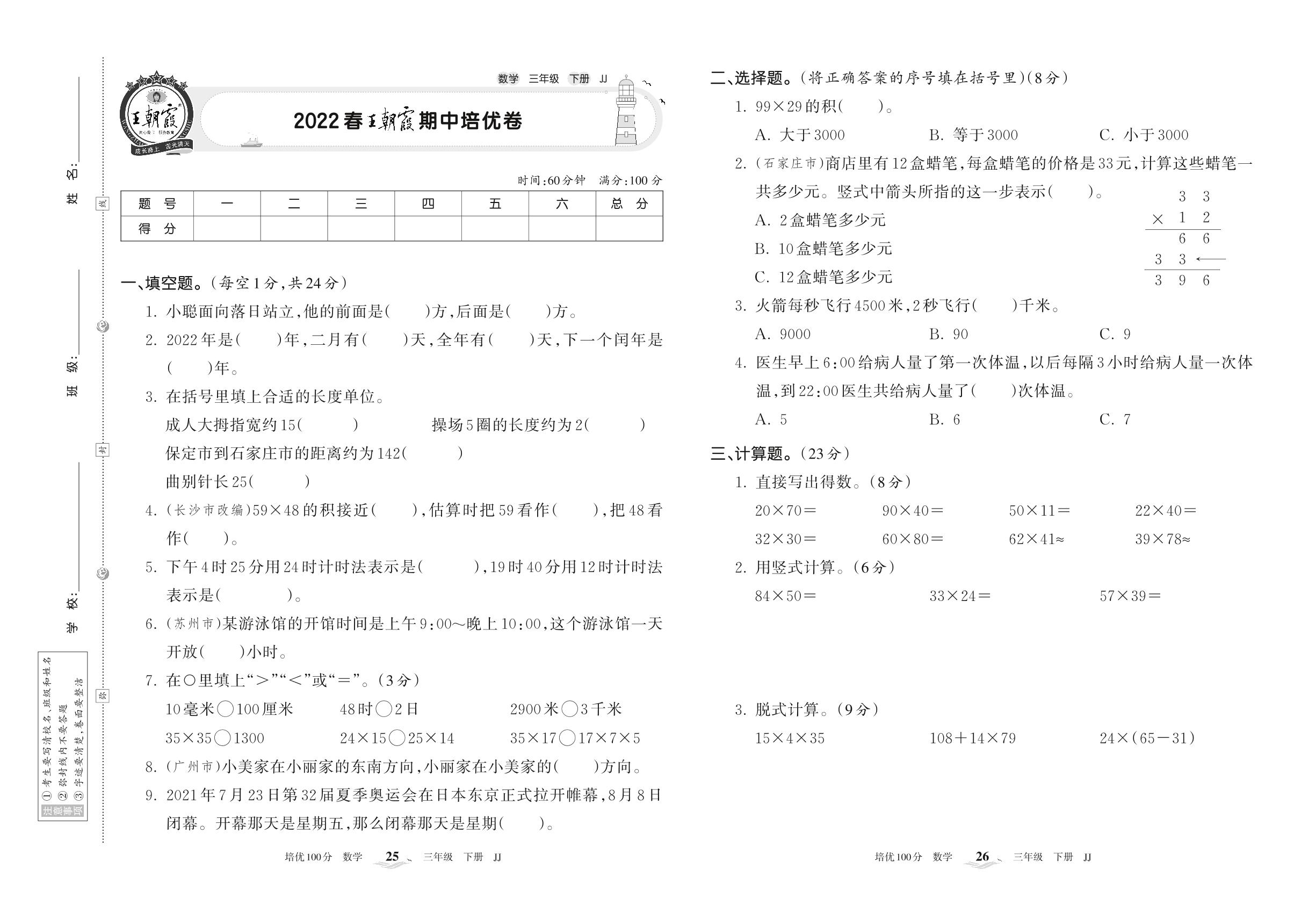 2022下册三年级数学冀教版 王朝霞期中培优卷