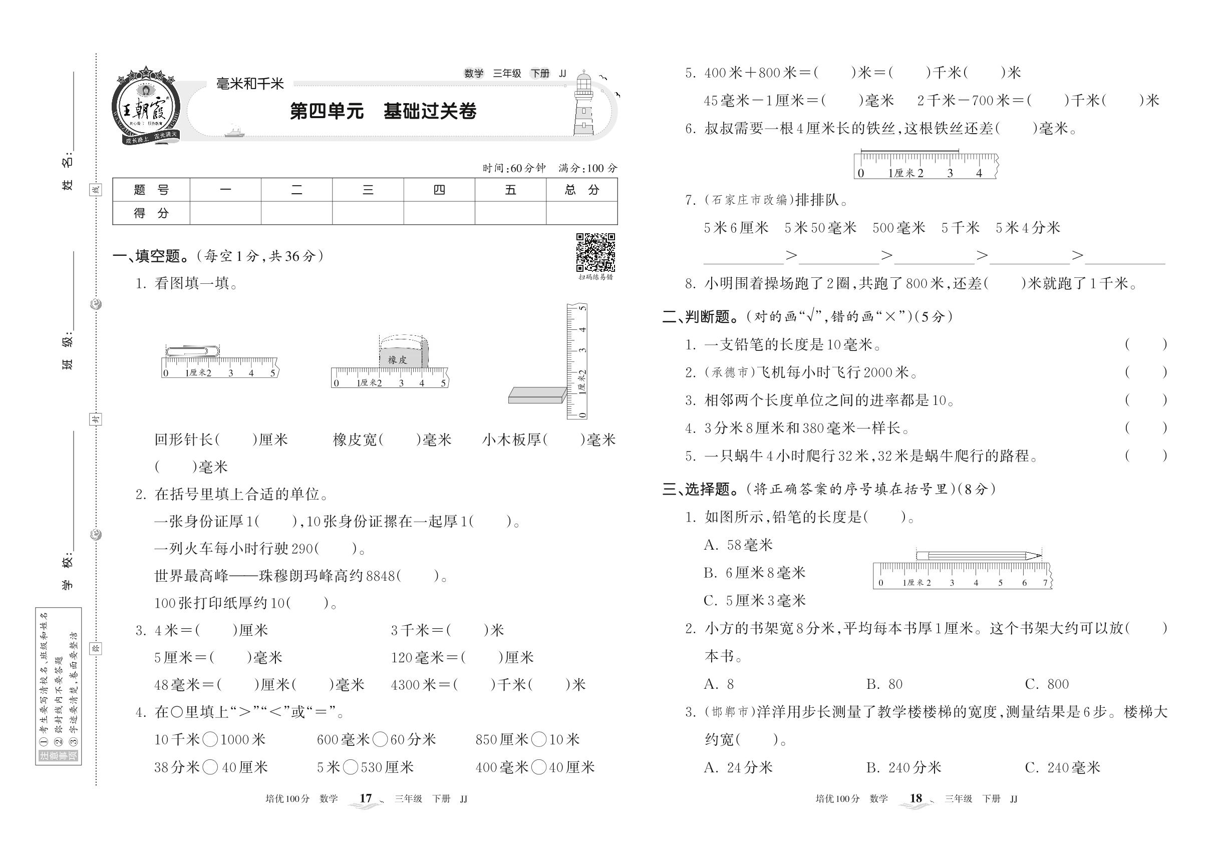 三年级数学冀教版下册单元卷