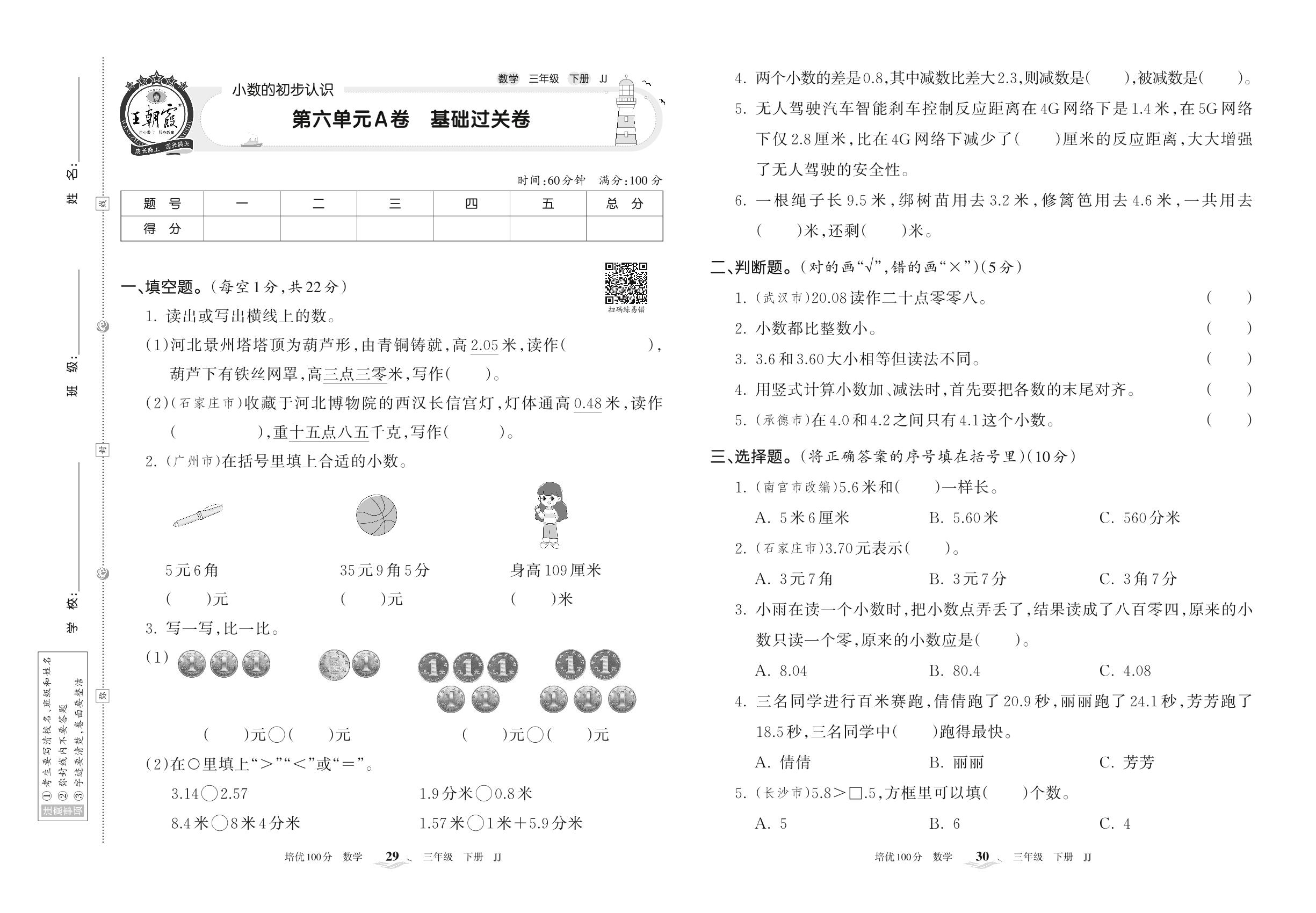2022下册三年级数学冀教版 第六单元A卷 基础过关卷