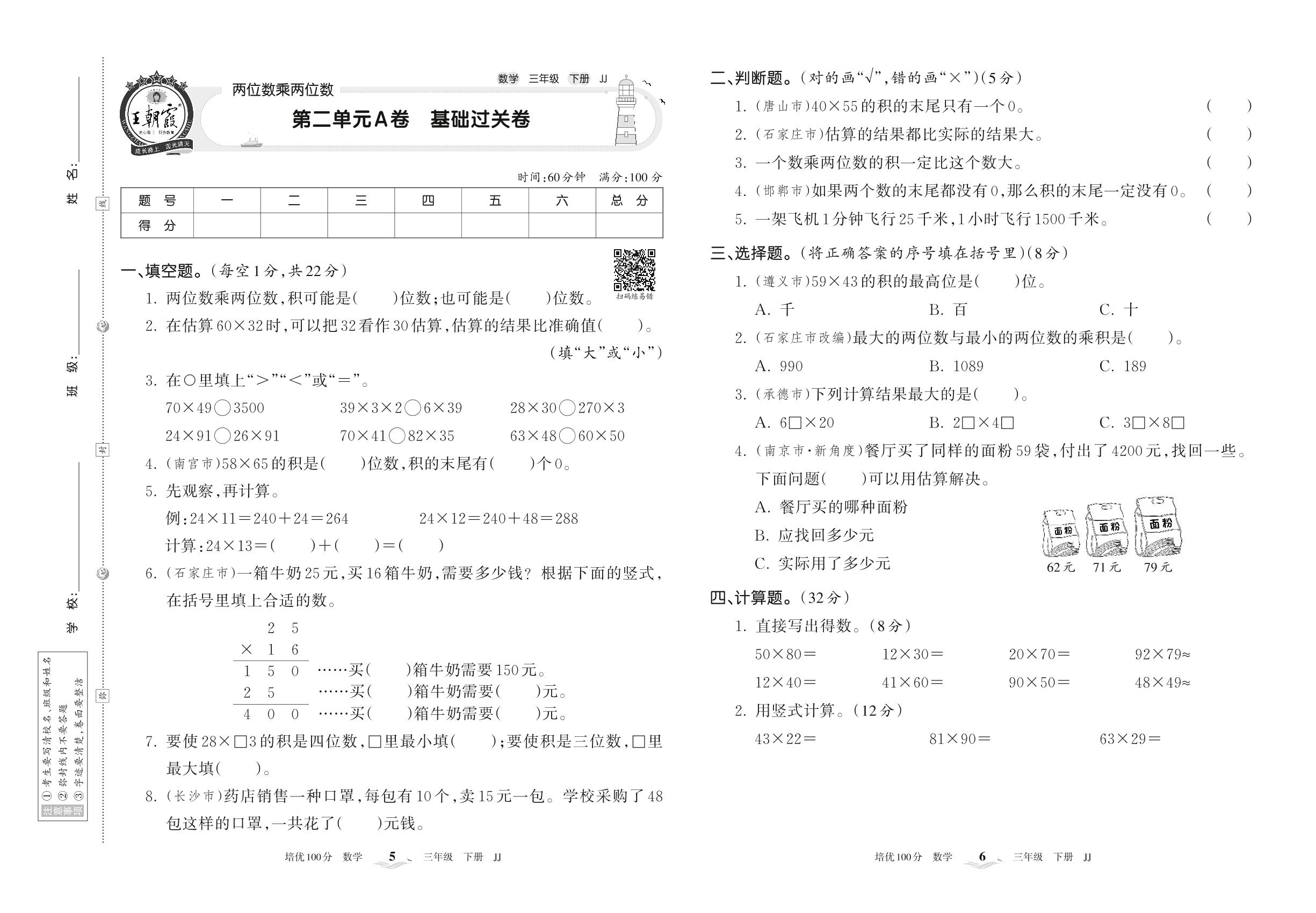2022下册三年级数学冀教版 第二单元A卷 基础过关卷