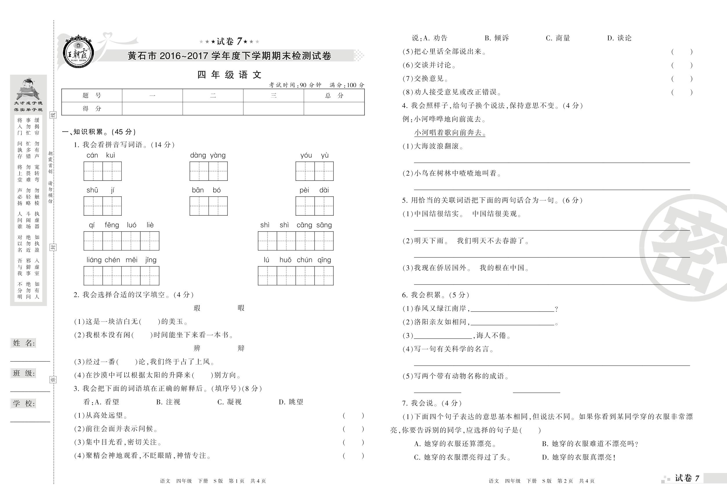 2016-2017学年第二学期黄石市四年级语文试卷(S版)【7】