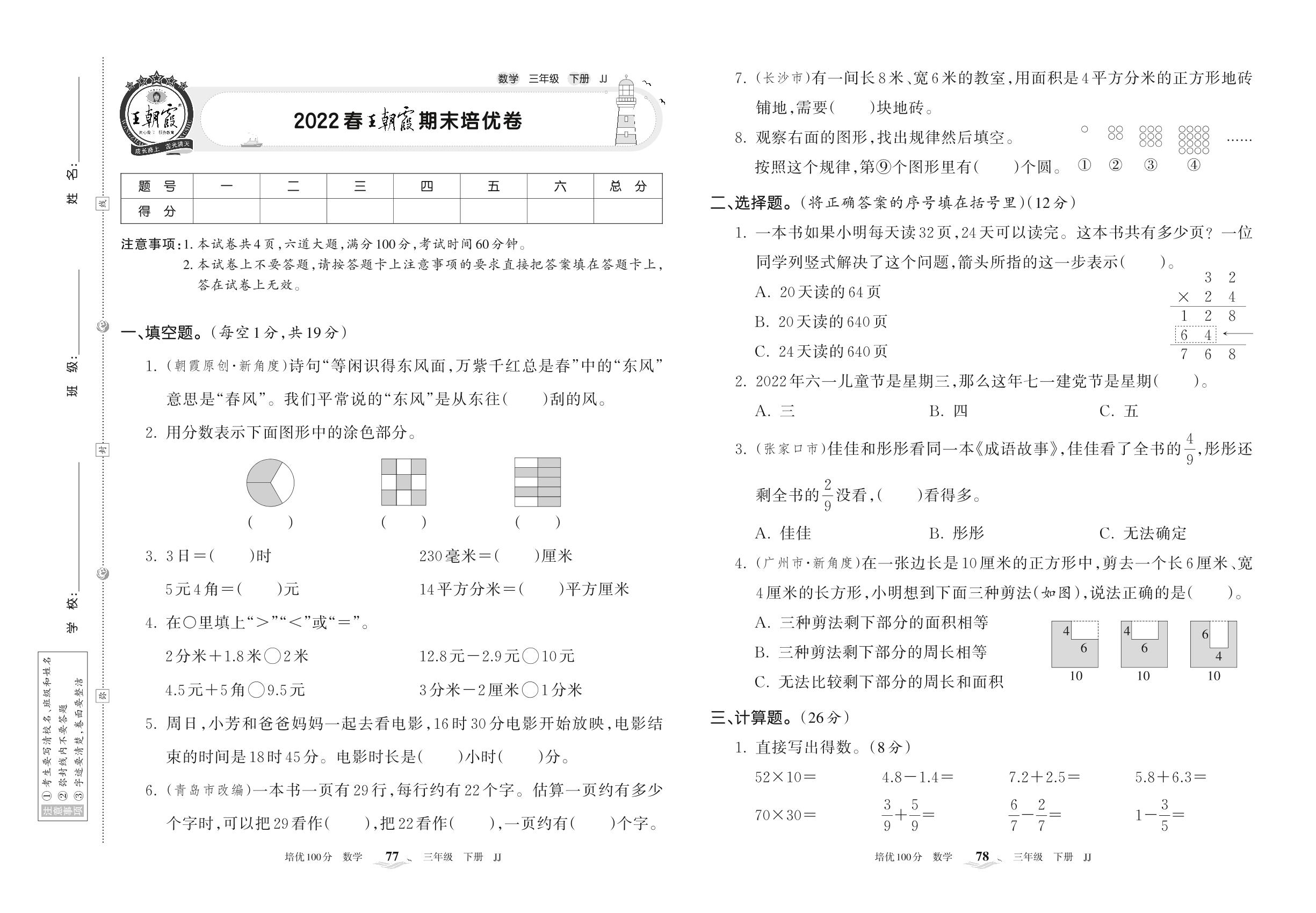 2022下册三年级数学冀教版 王朝霞期末培优卷