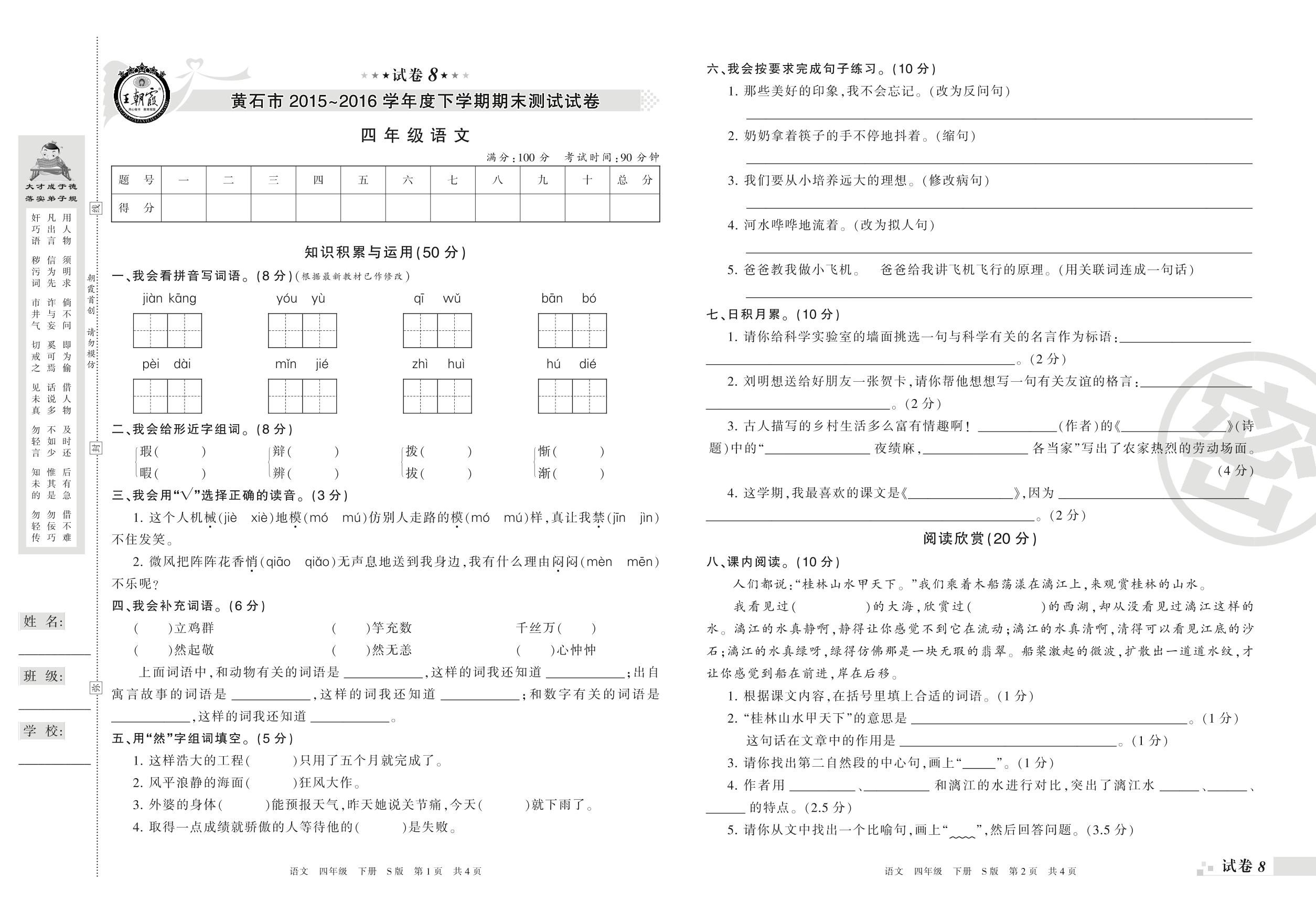 2015-2016学年第二学期黄石市四年级语文试卷(S版)_R210801225532【8】