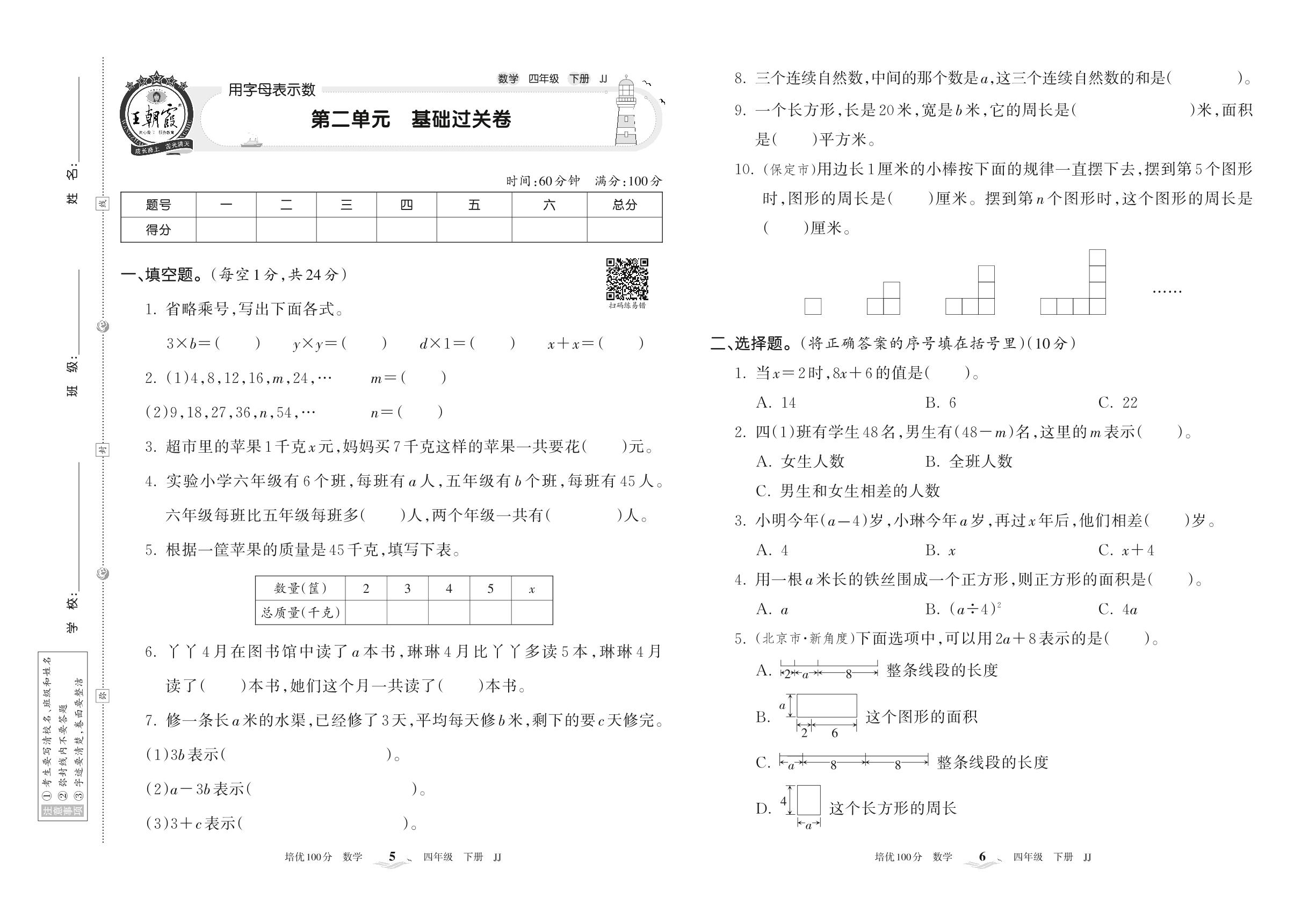 2022下册四年级数学冀教版 第二单元 基础过关卷