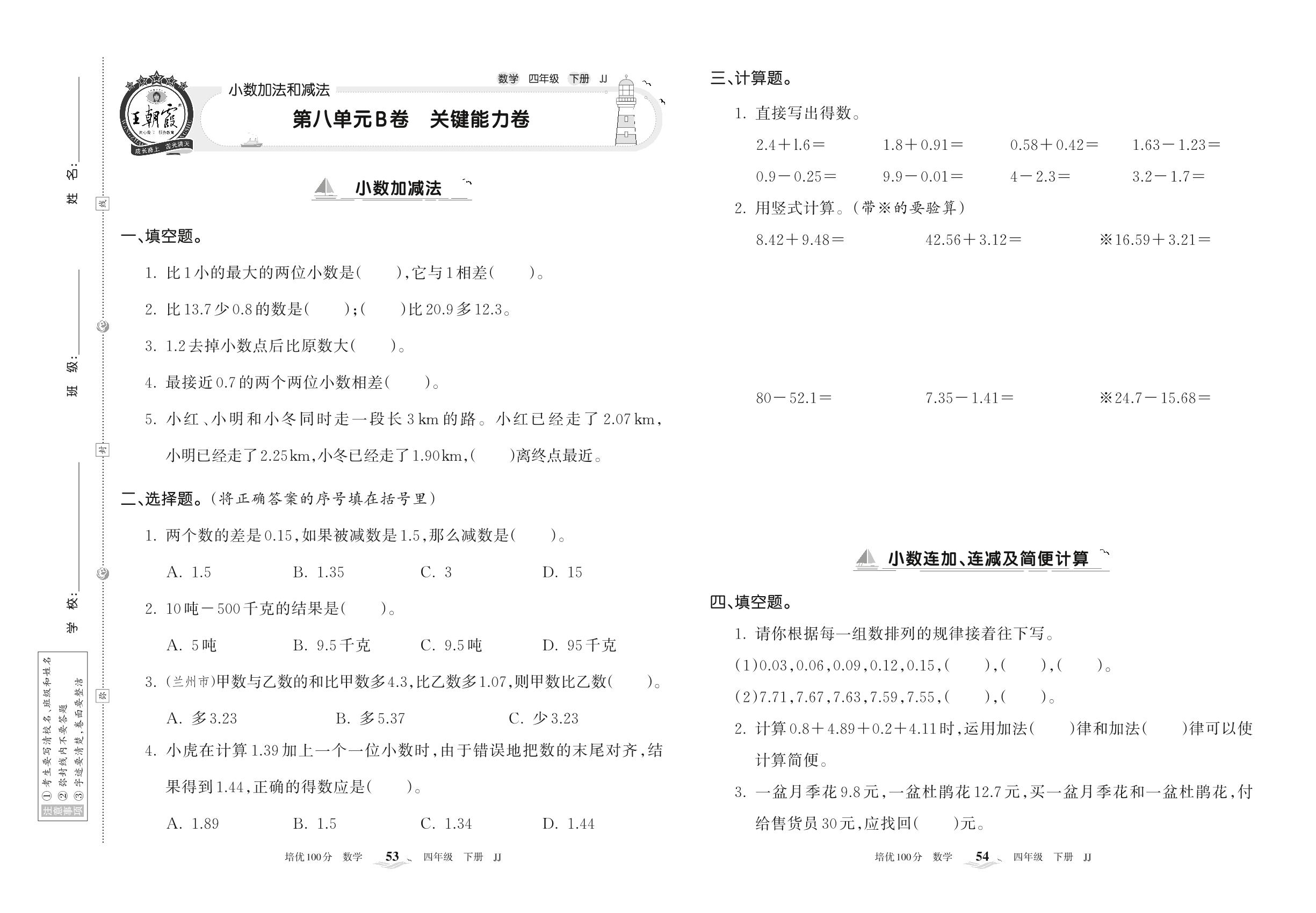 四年级数学冀教版下册单元卷