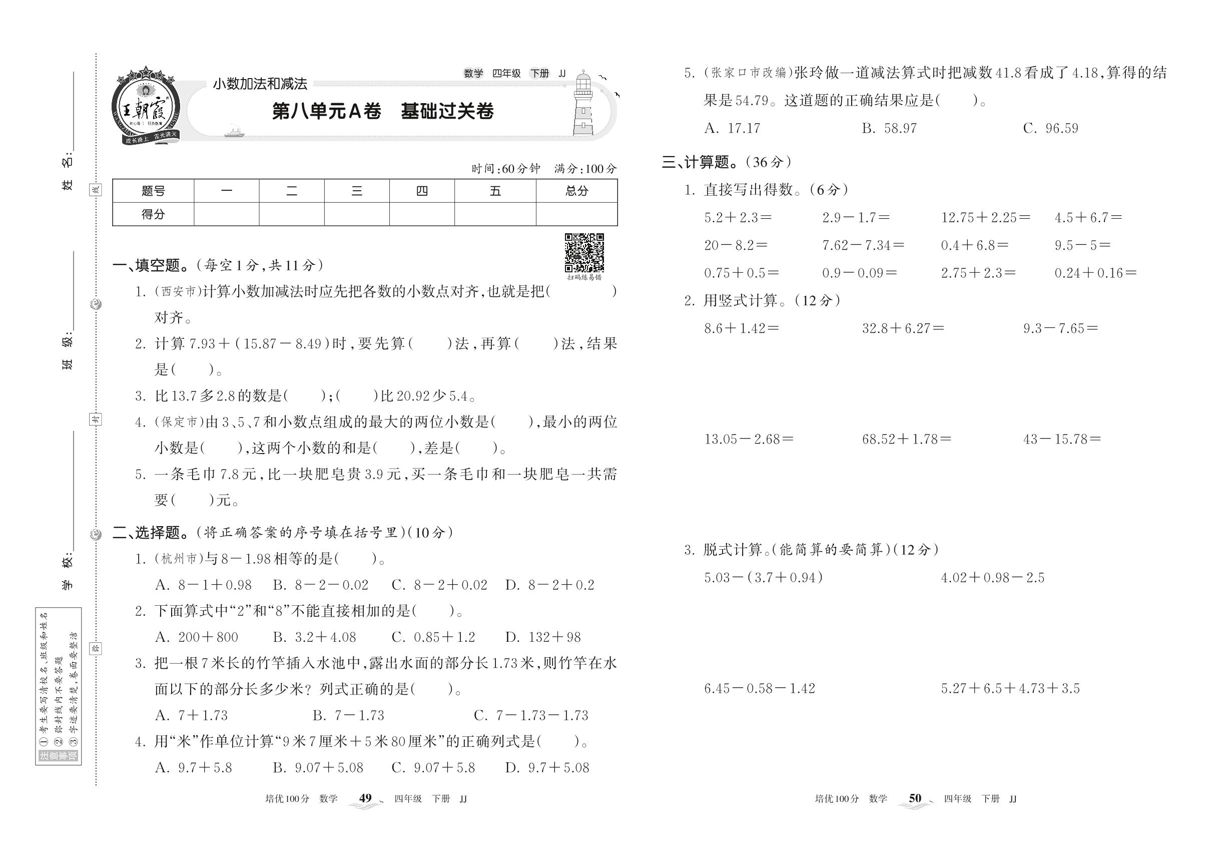 四年级数学冀教版下册单元卷