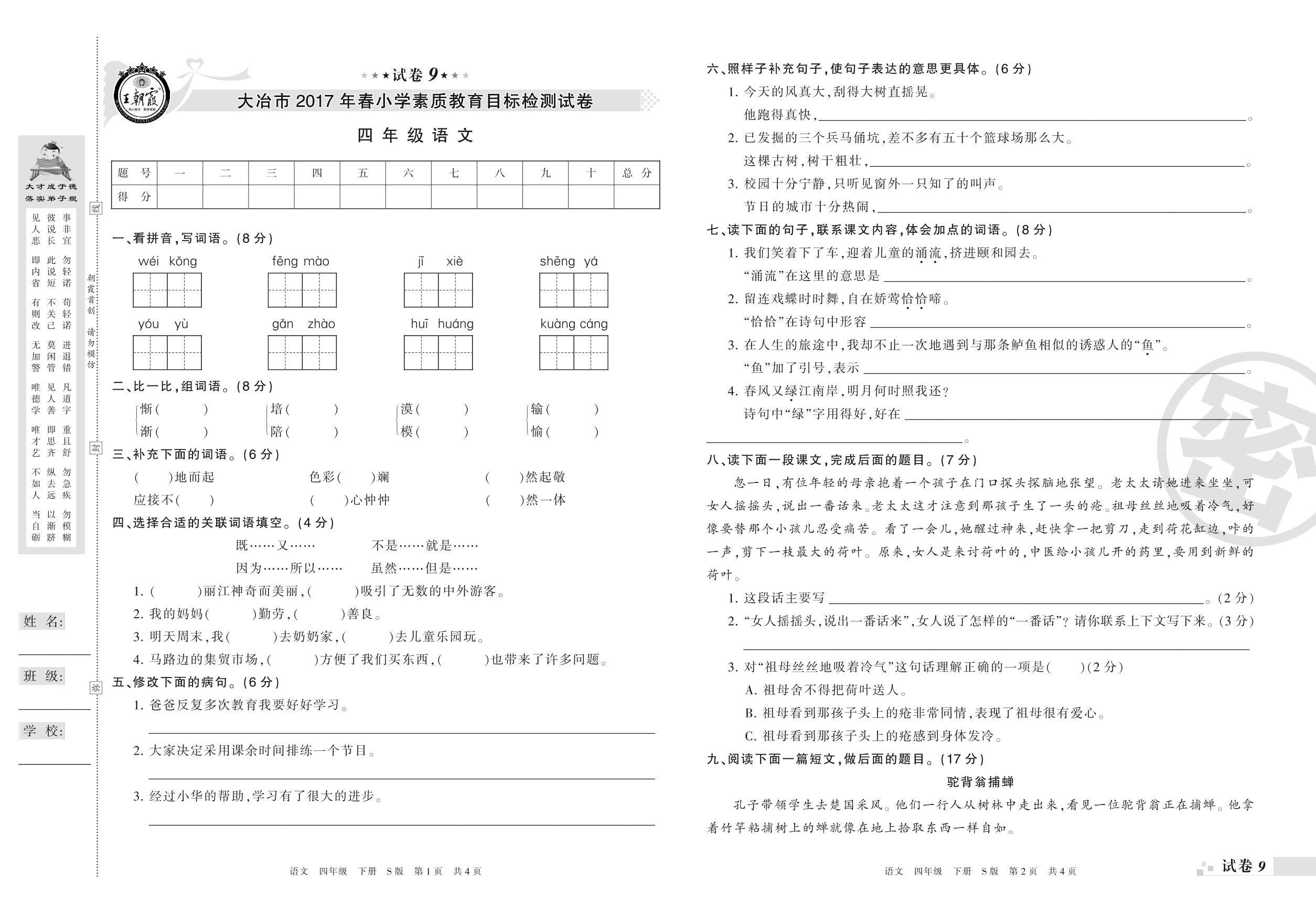 2016-2017学年第二学期大冶市四年级语文试卷(S版)【9】