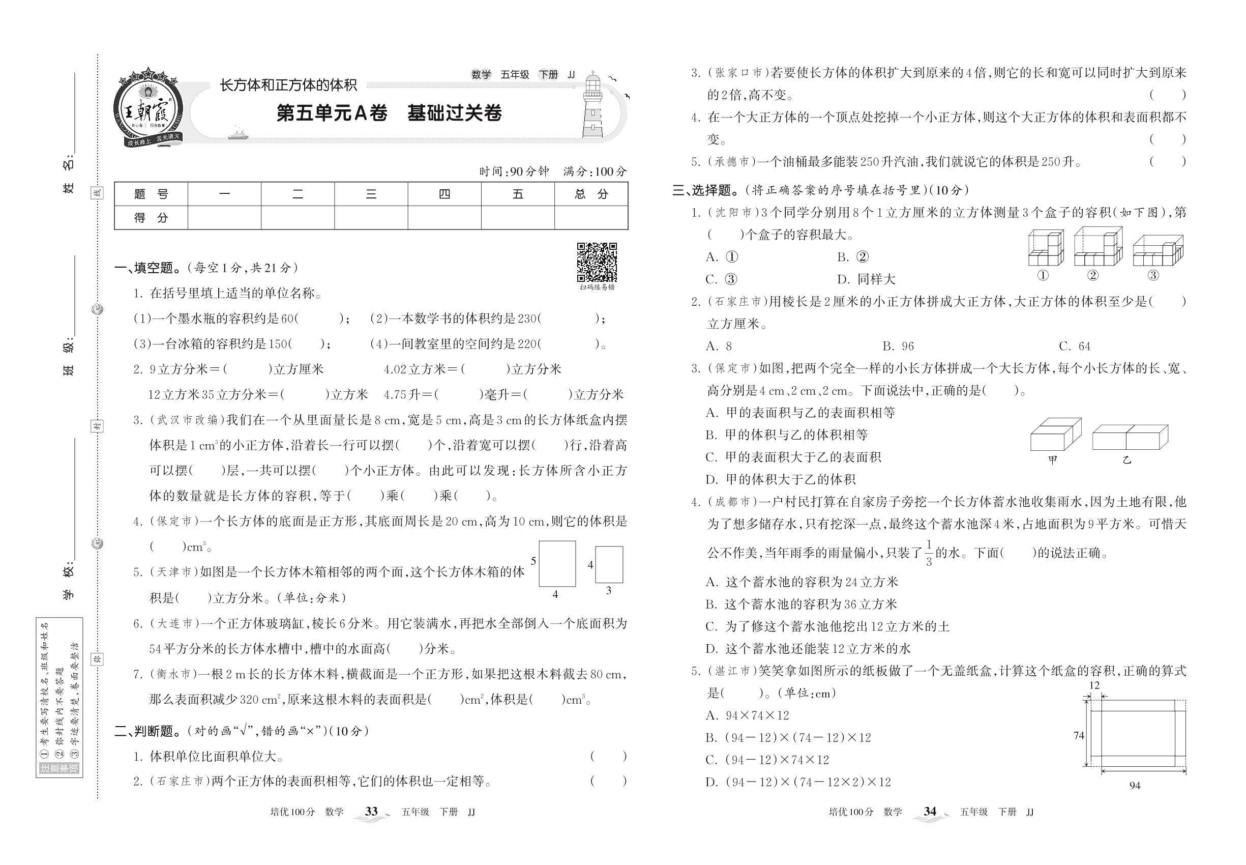 2022下册五年级数学冀教版 第五单元A卷 基础过关卷