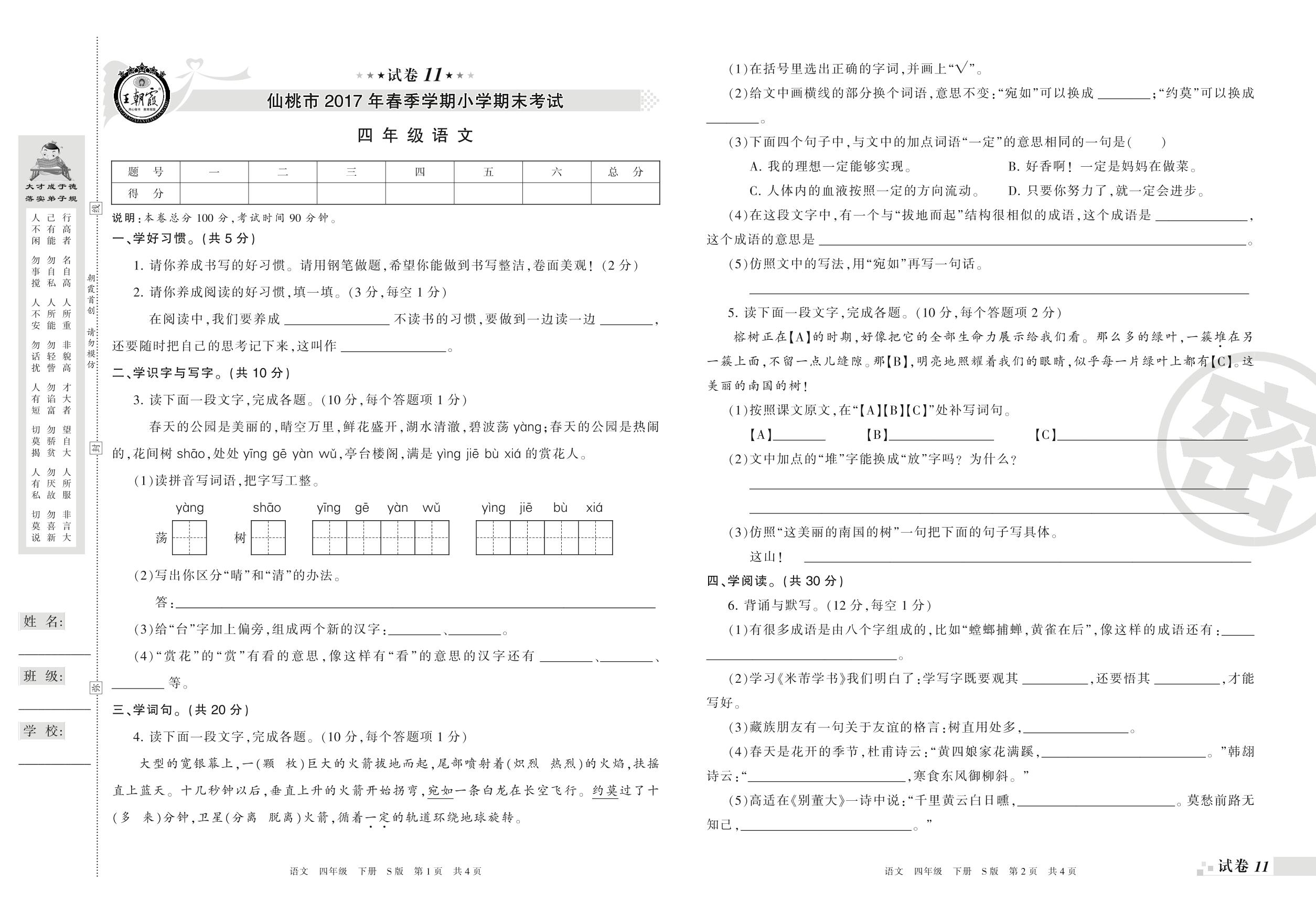 2016-2017学年第二学期仙桃市四年级语文试卷(S版)【11】