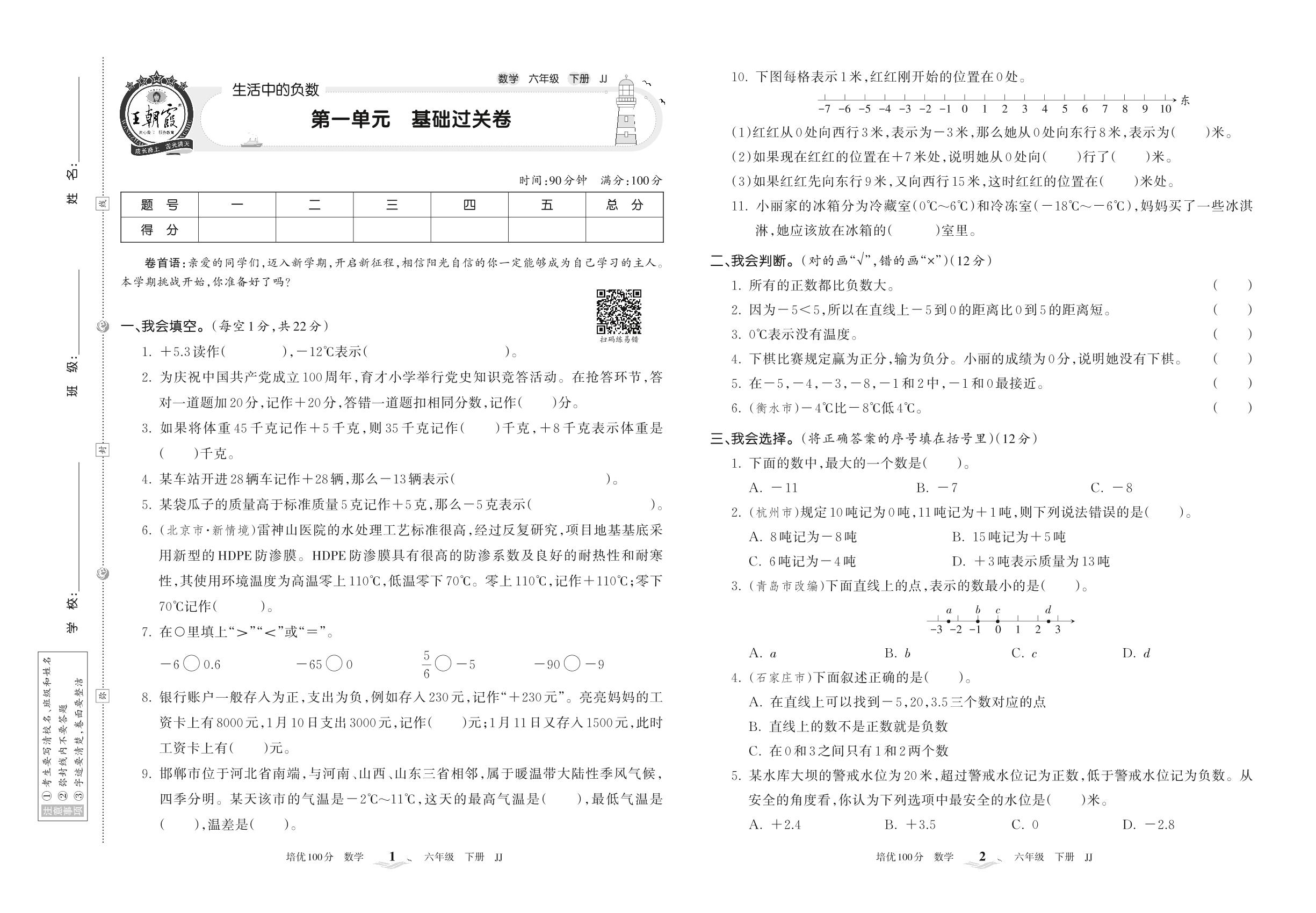 2022下册六年级数学冀教版 第一单元 基础过关卷