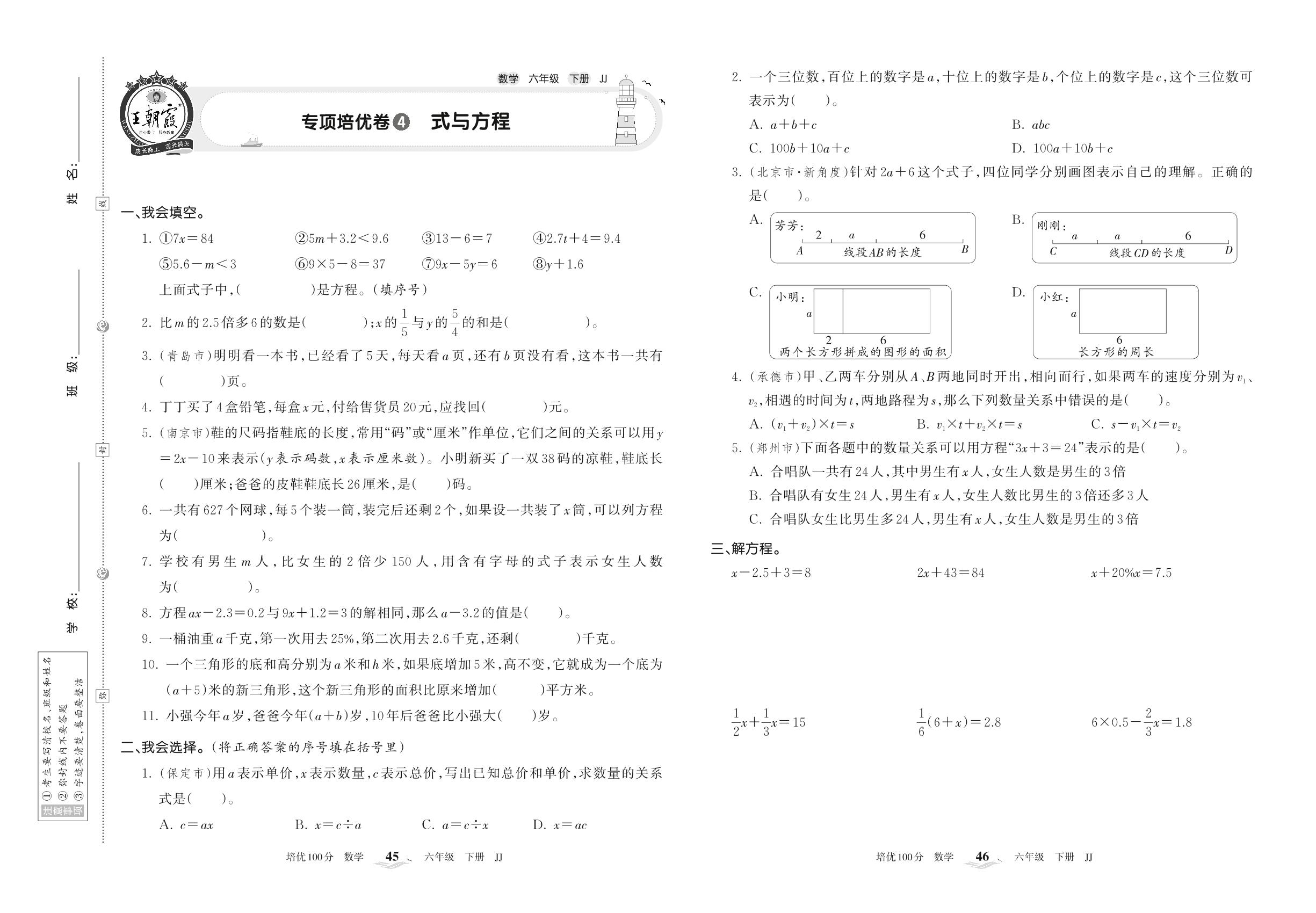 2022下册六年级数学冀教版 专项培优卷4 式与方程