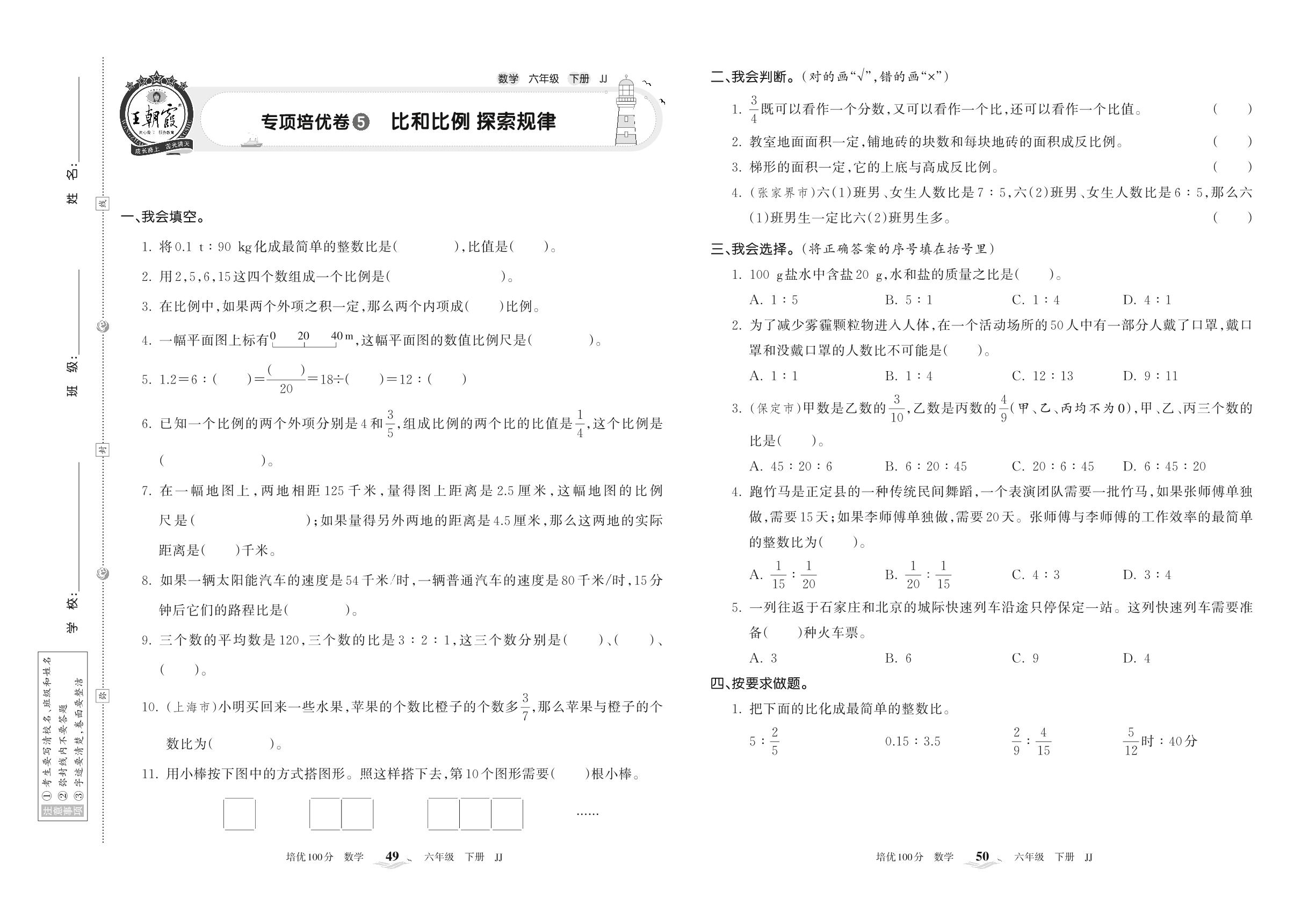 2022下册六年级数学冀教版 专项培优卷5 比和比例 探索规律