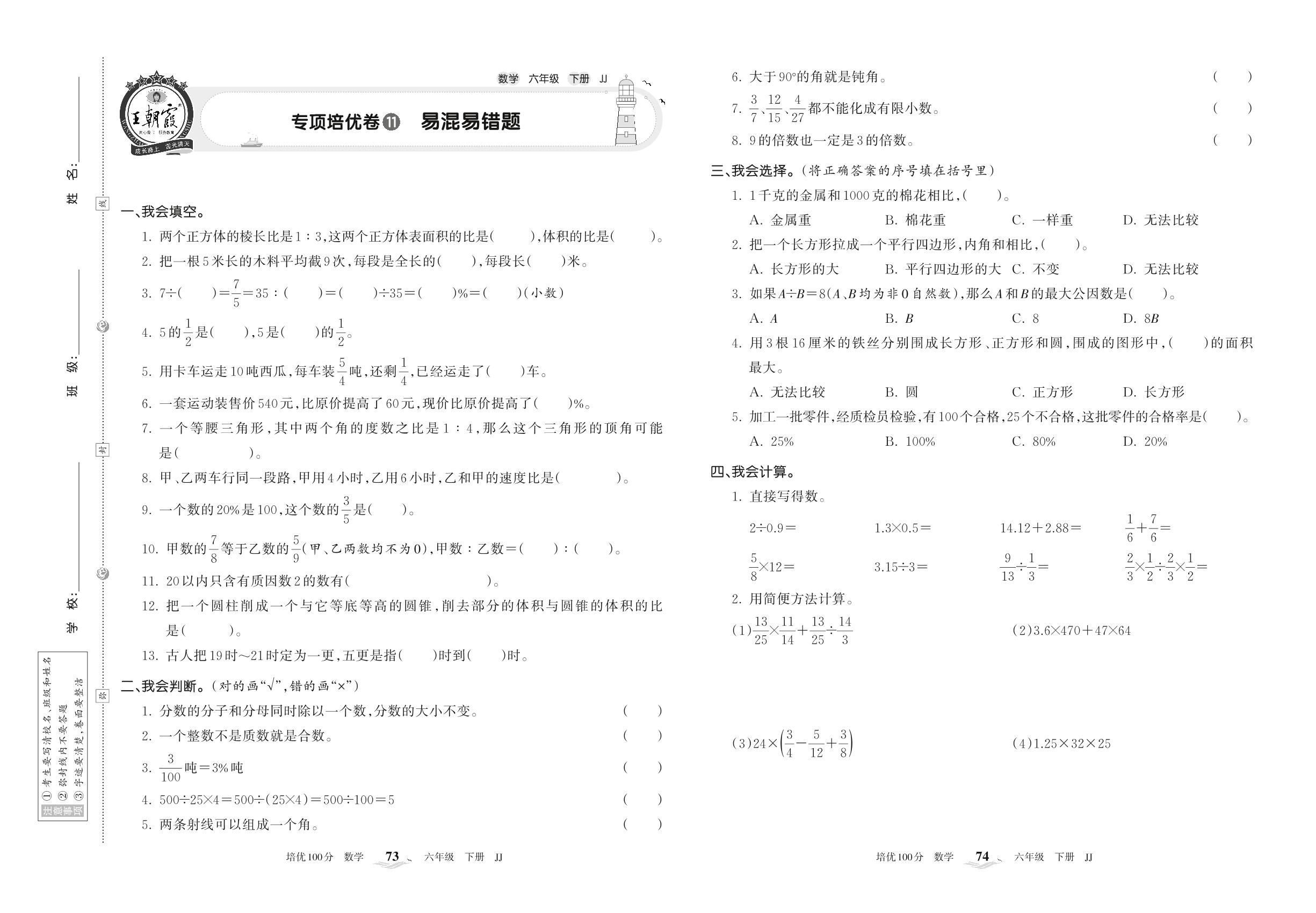 2022下册六年级数学冀教版 专项培优卷11 易混易错题