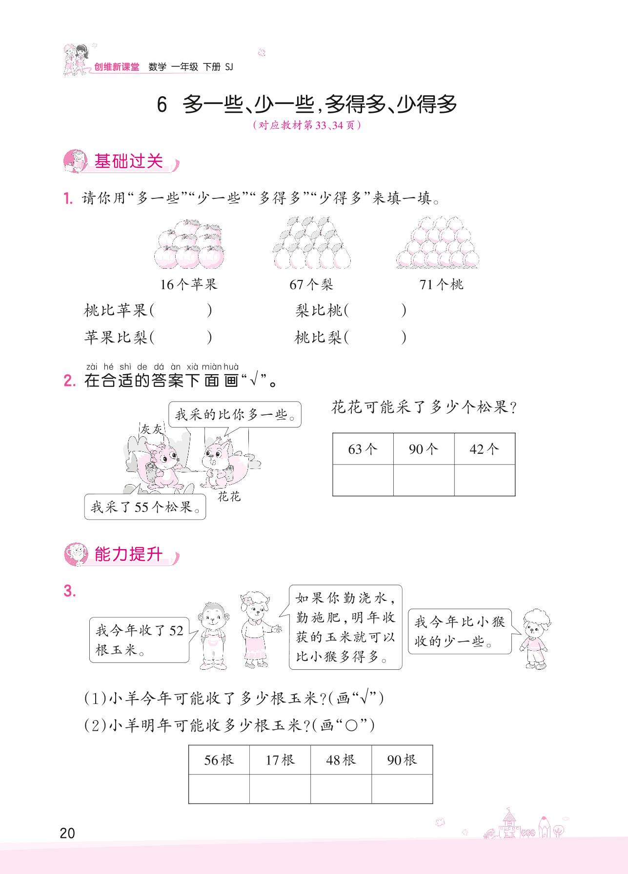 2022下册一年级数学苏教版 三 认识100以内的数——6 多一些、少一些,多得多、少得多