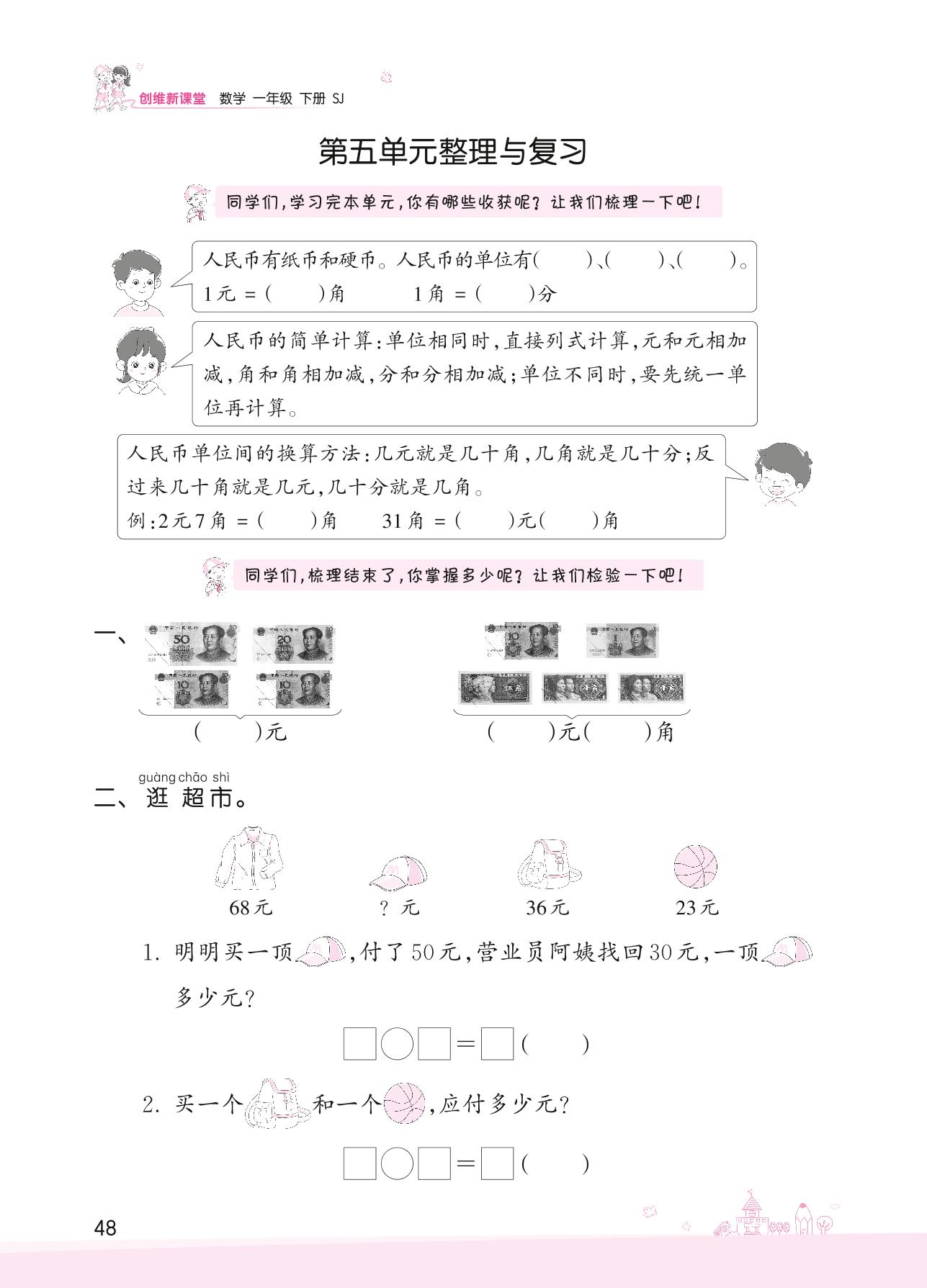 2022下册一年级数学苏教版 五 元、角、分——第五单元整理与复习