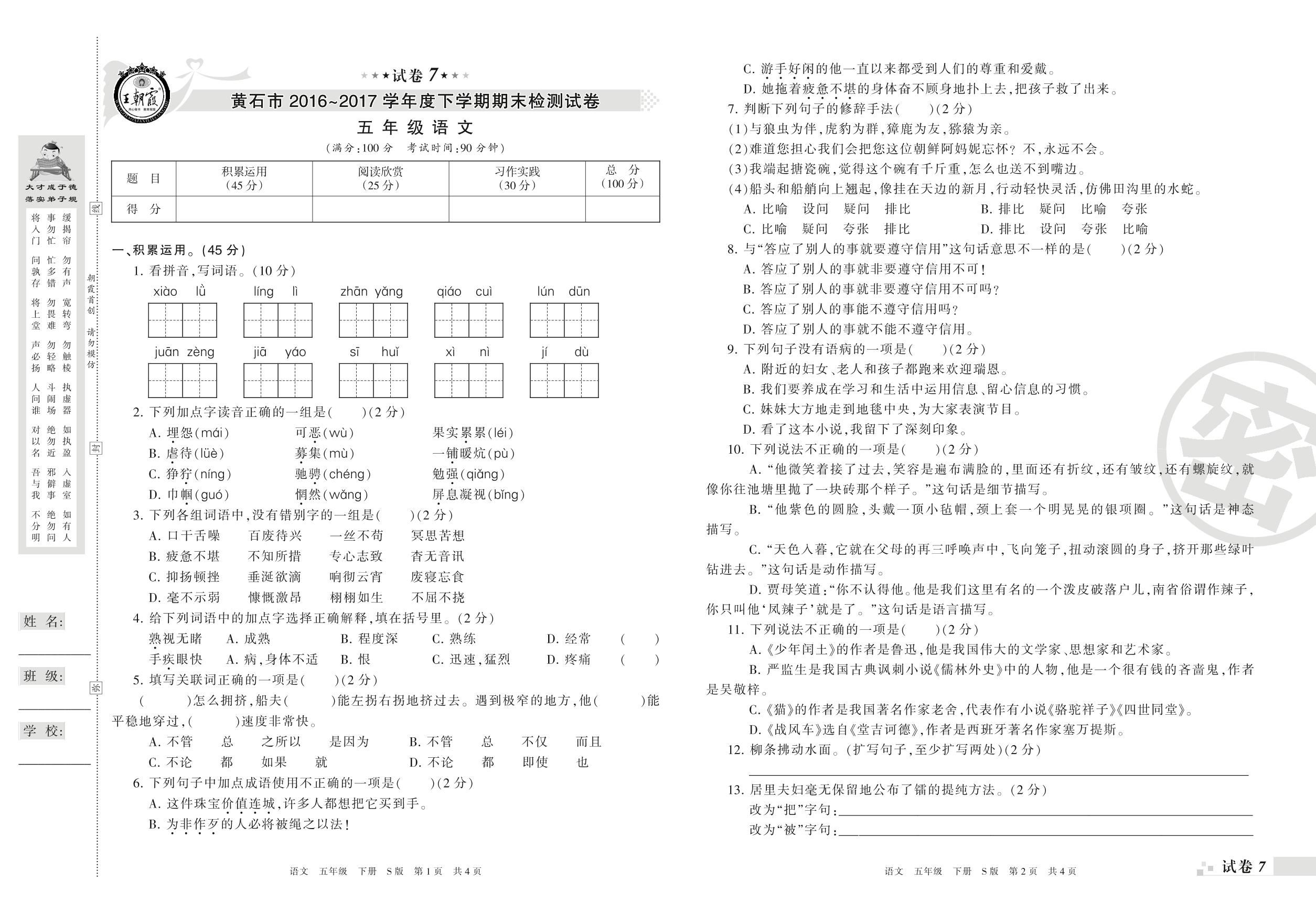 2016-2017学年第二学期黄石市五年级语文试卷(S版)【7】
