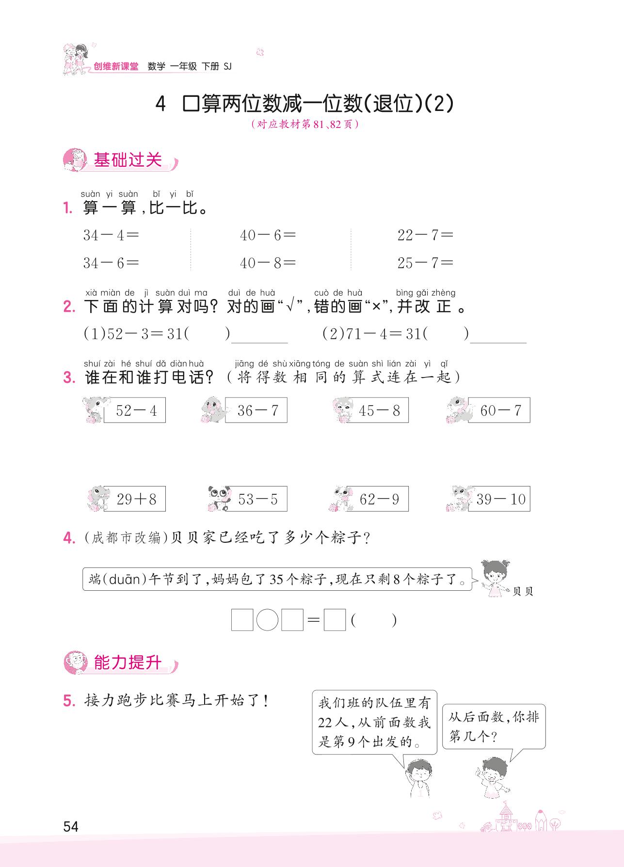 2022下册一年级数学苏教版 六 100以内的加法和减法(二)——4 口算两位数减一位数(退位)(2)