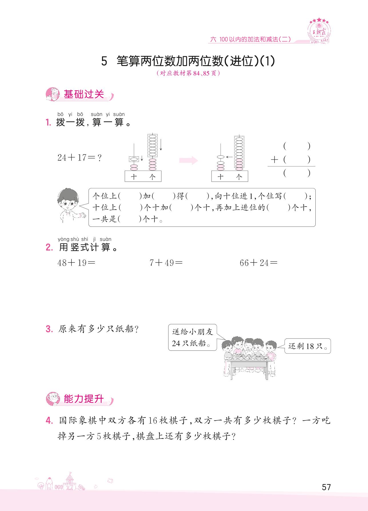 2022下册一年级数学苏教版 六 100以内的加法和减法(二)——5 笔算两位数加两位数(进位)(1)