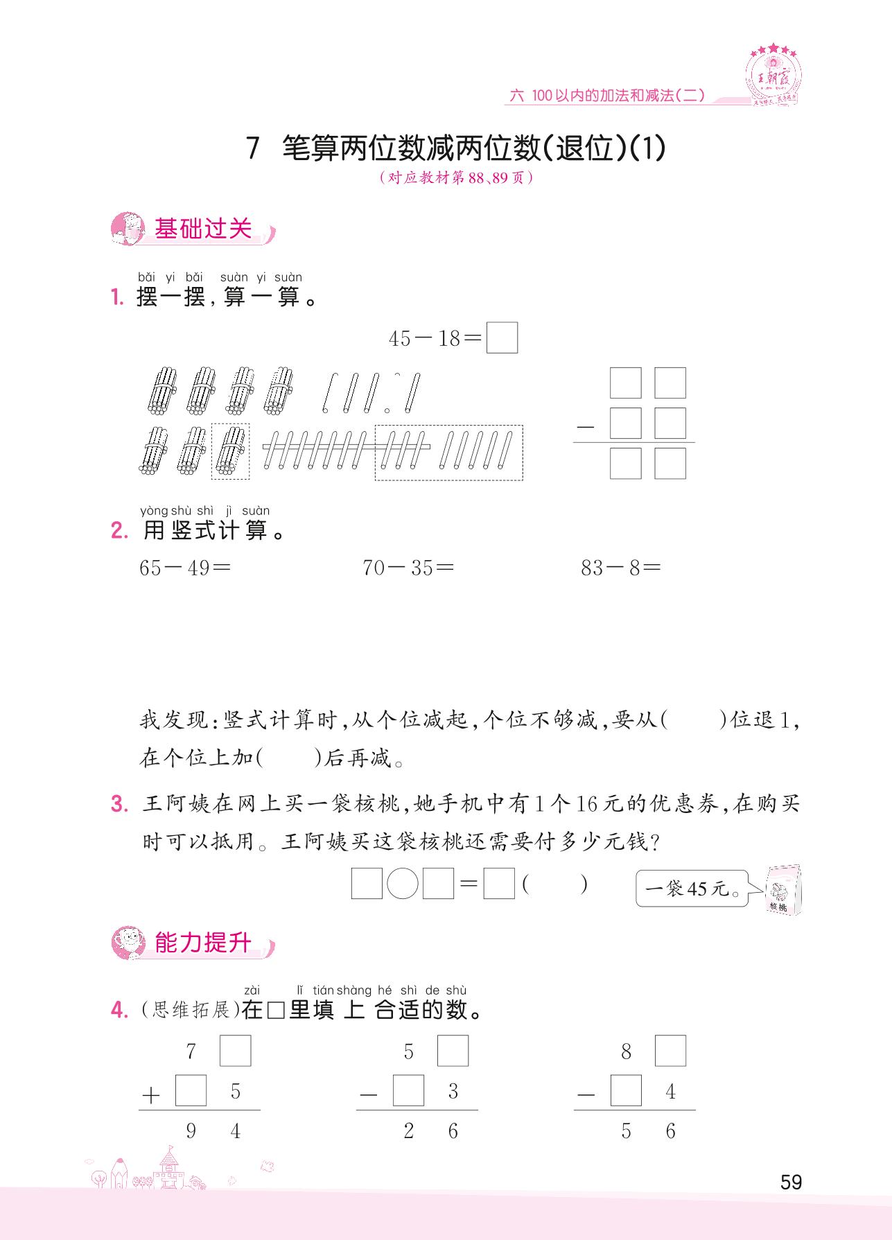 2022下册一年级数学苏教版 六 100以内的加法和减法(二)——7 笔算两位数减两位数(退位)(1)
