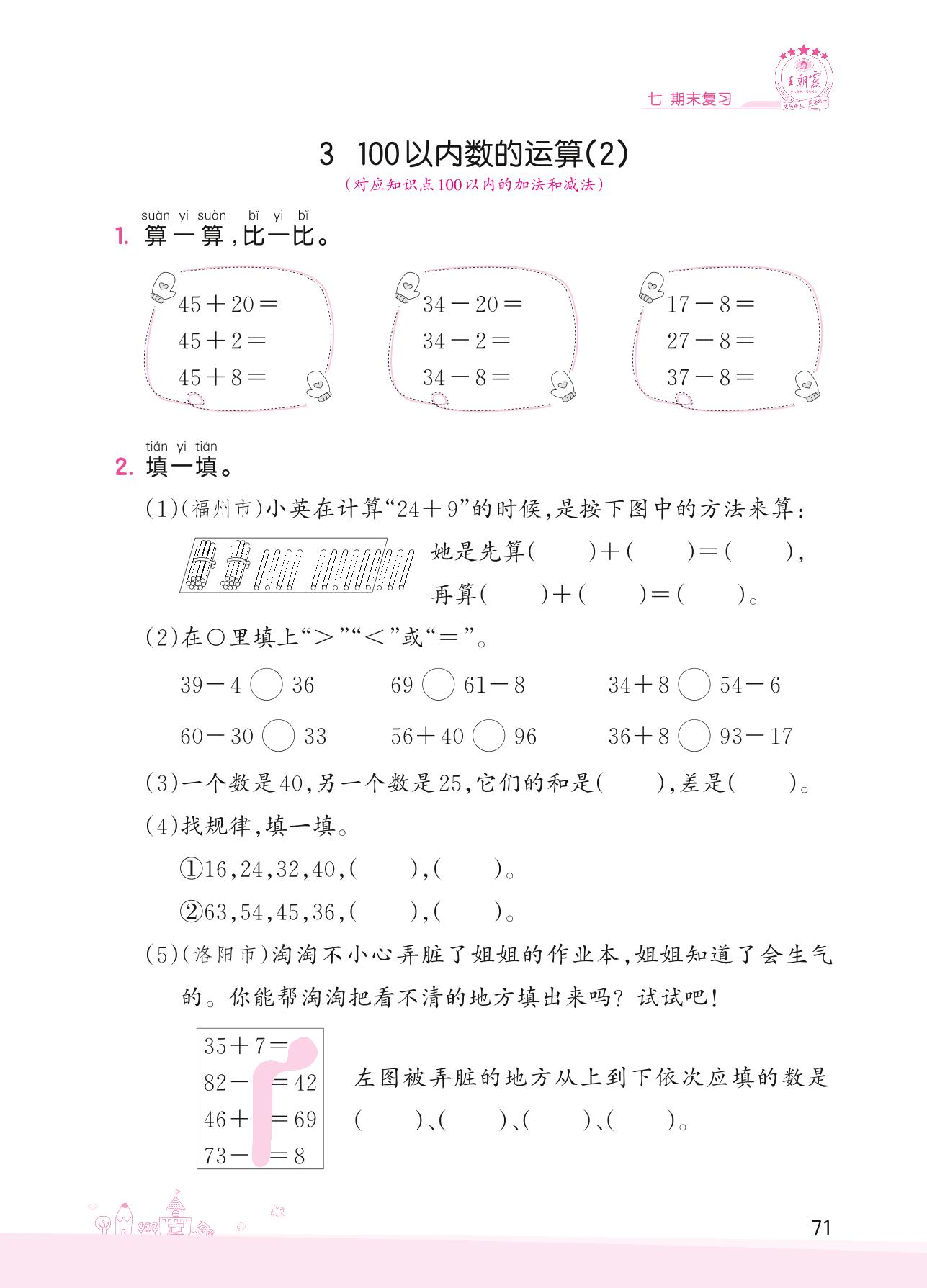 2022下册一年级数学苏教版 七 期末复习——3 100以内数的运算(2)