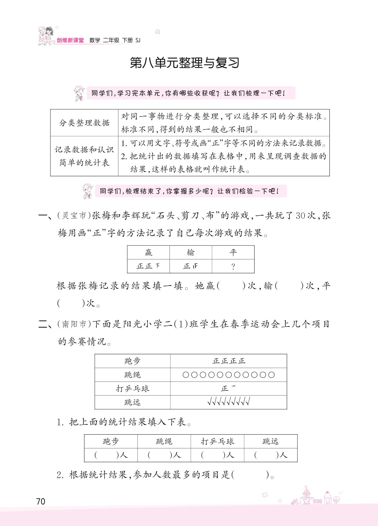 2022下册二年级数学苏教版 八 数据的收集和整理(一)——第八单元整理与复习