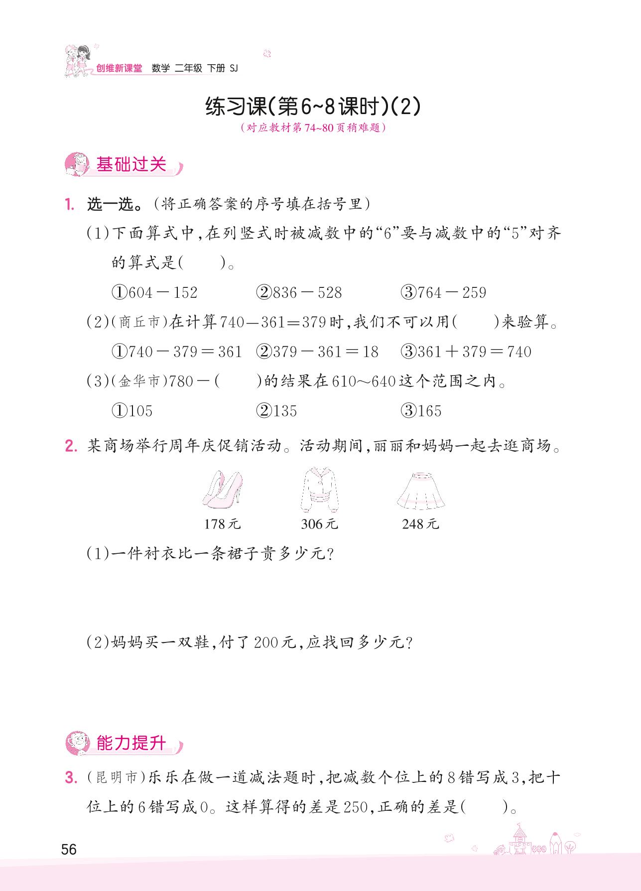 2022下册二年级数学苏教版 六 两、三位数的加法和减法——练习课(第6~8课时)(2)