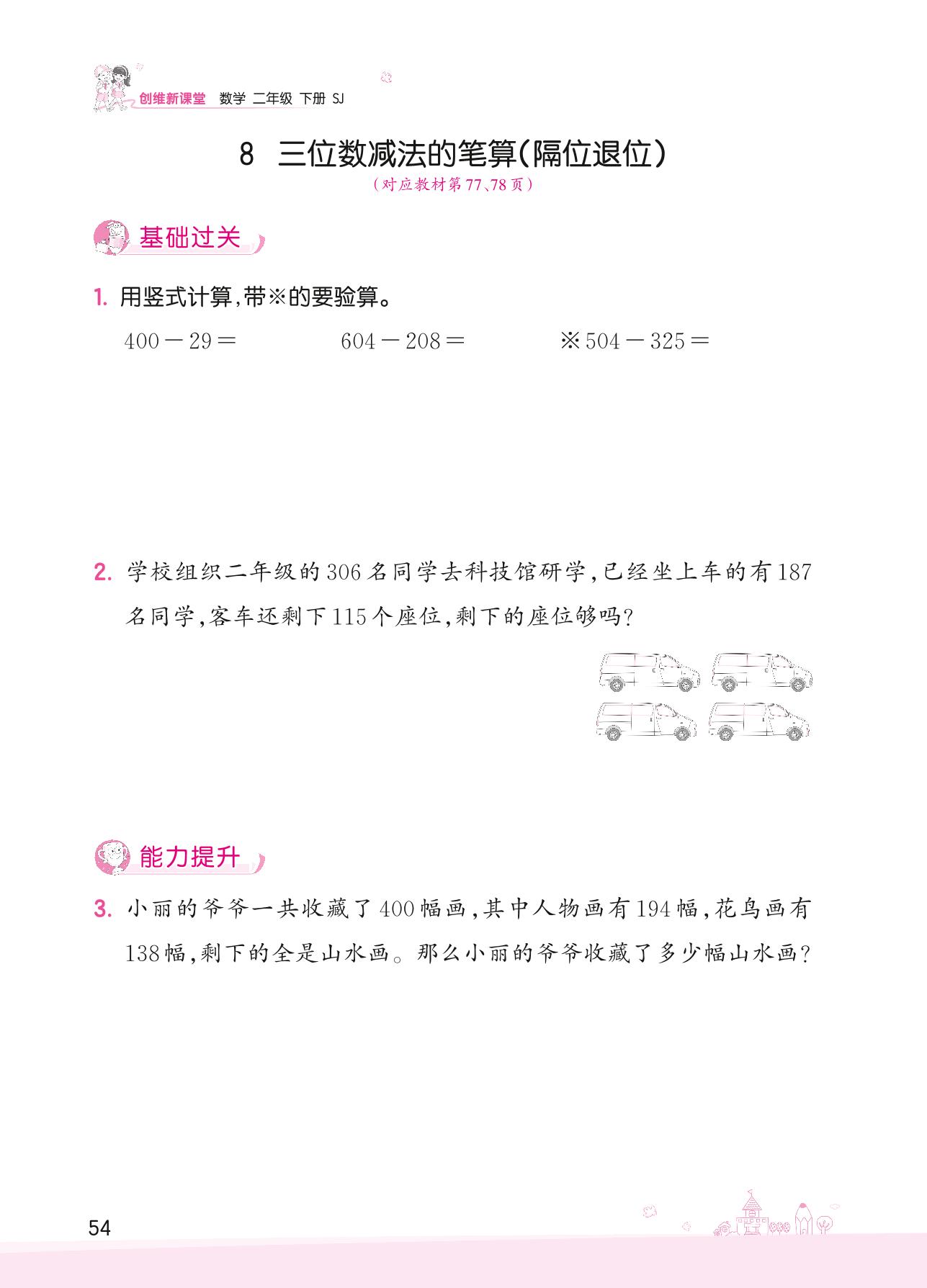 2022下册二年级数学苏教版 六 两、三位数的加法和减法——8 三位数减法的笔算(隔位退位)