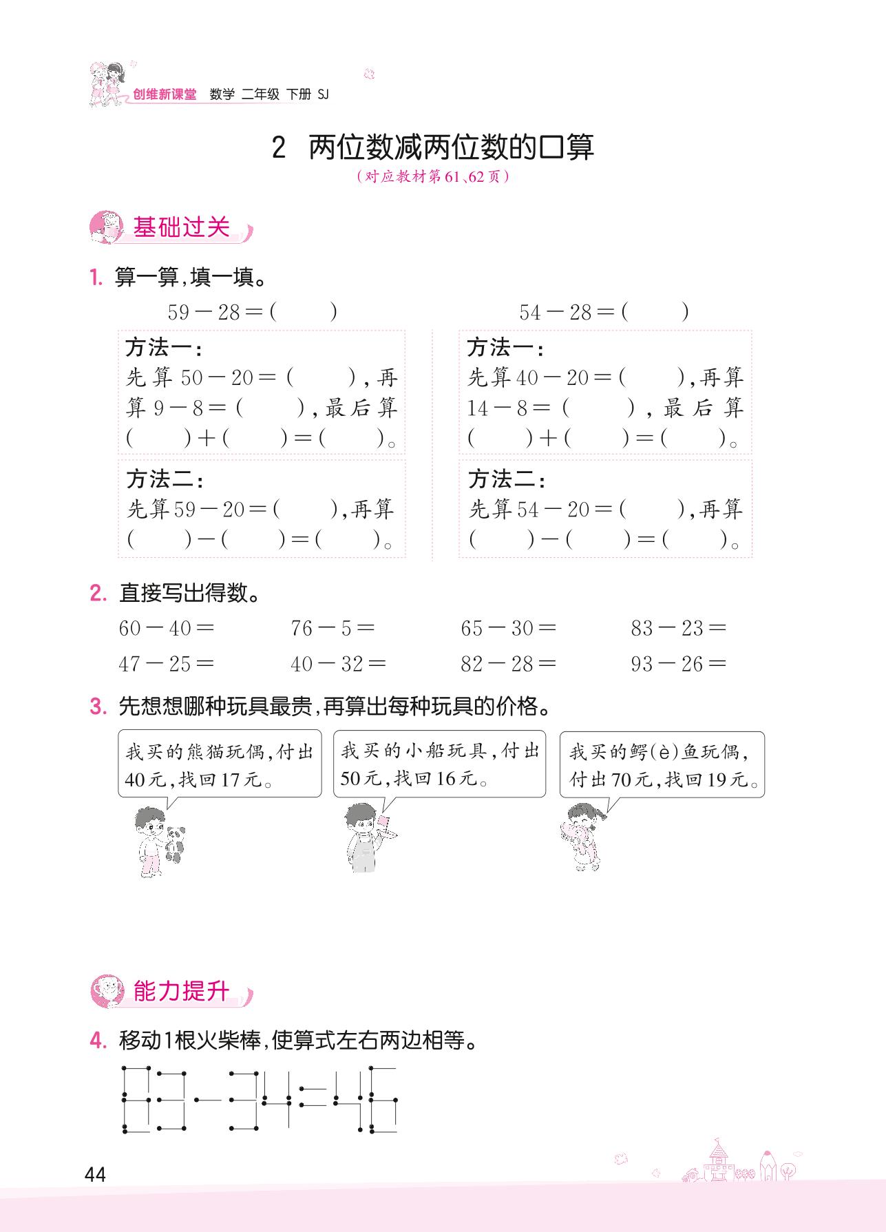 2022下册二年级数学苏教版 六 两、三位数的加法和减法——2 两位数减两位数的口算