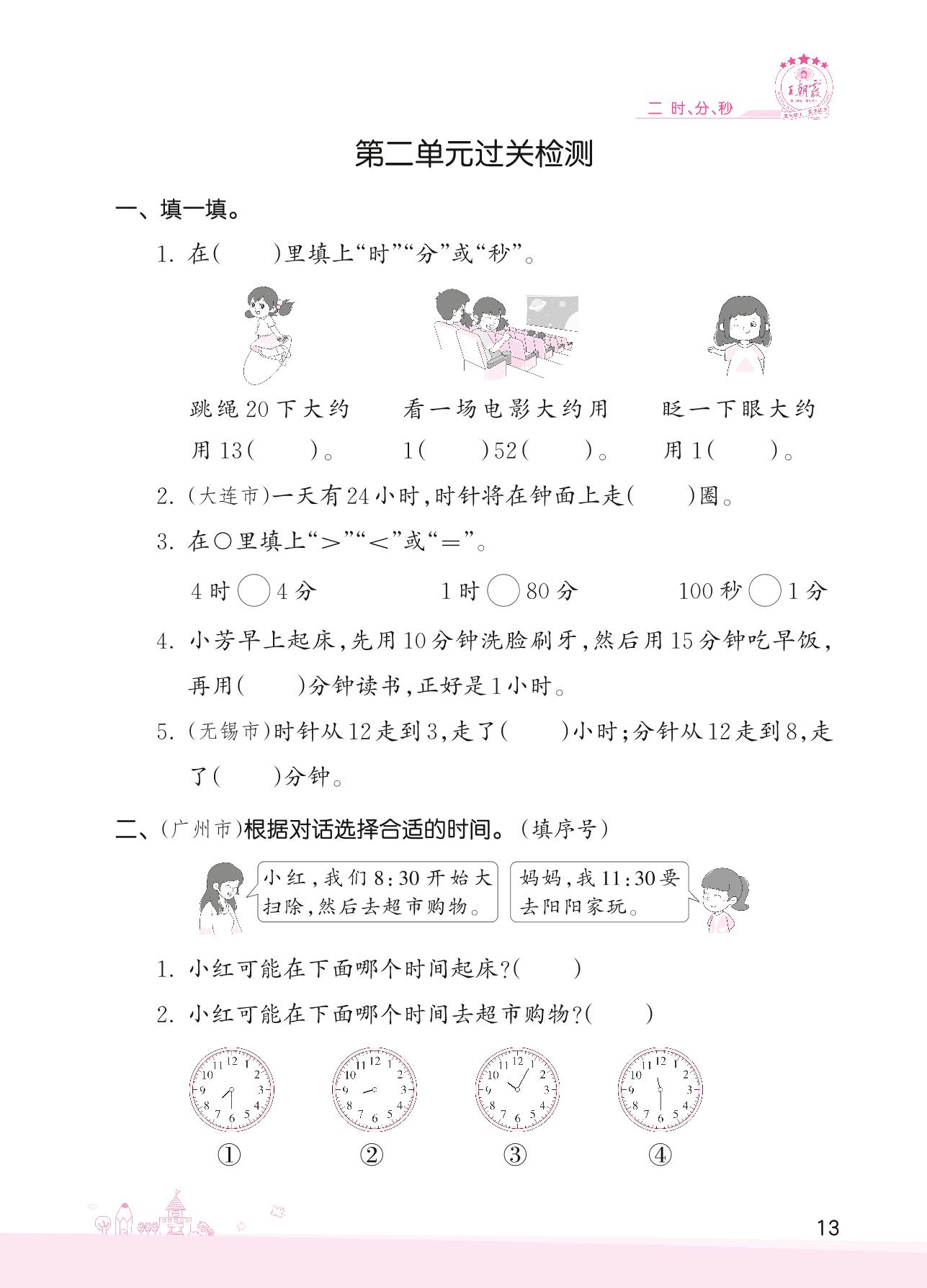 2022下册二年级数学苏教版 二 时、分、秒——第二单元过关检测