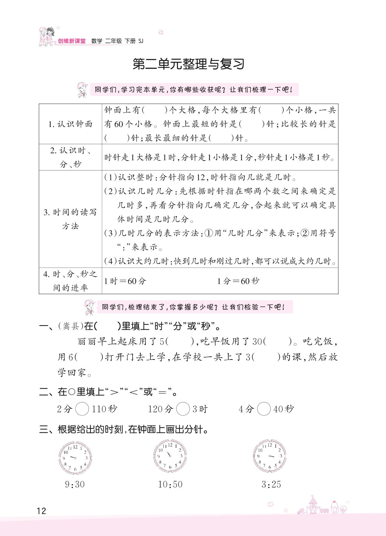 2022下册二年级数学苏教版 二 时、分、秒——第二单元整理与复习