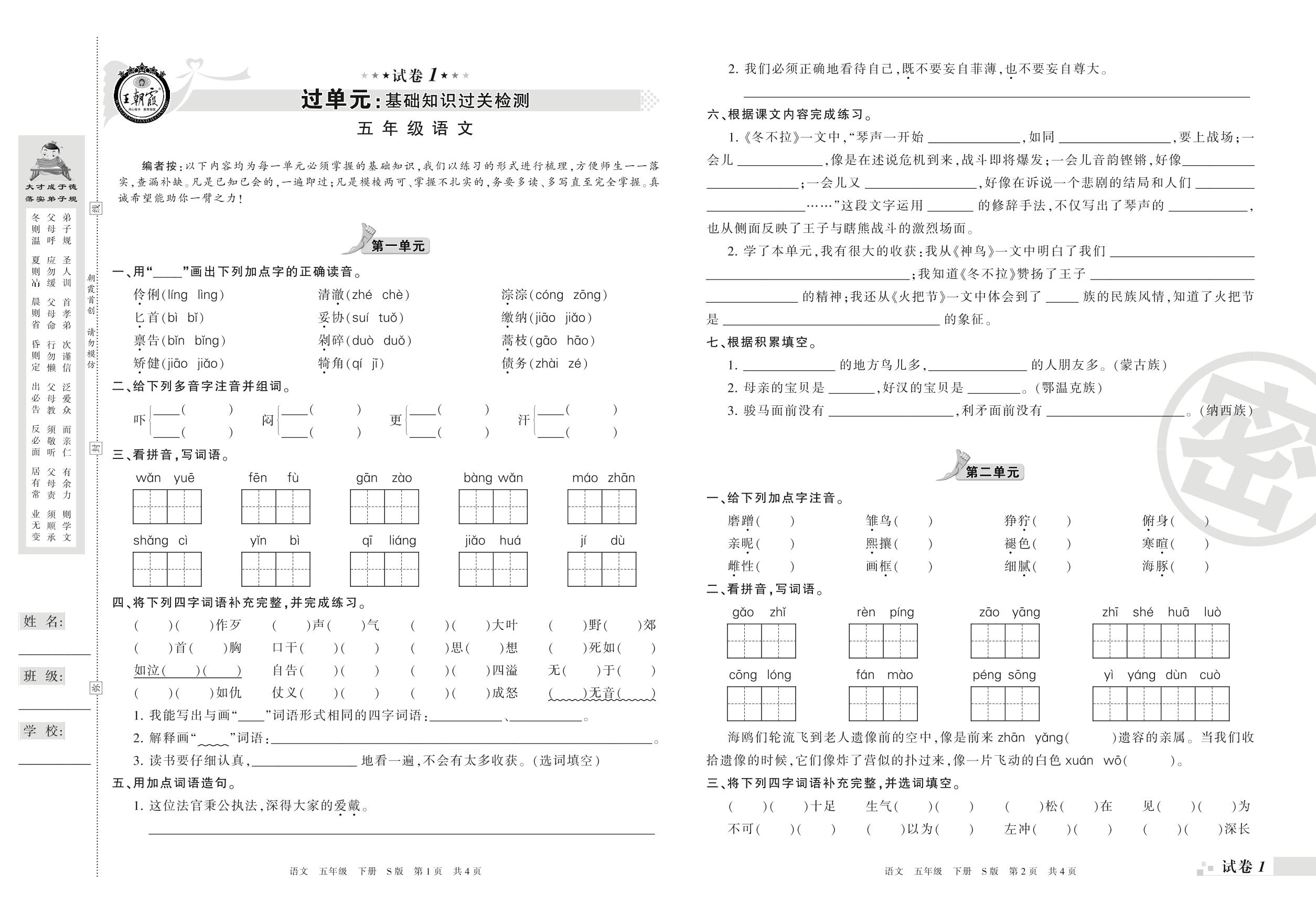 王朝霞期末过单元——基础知识过关检测五年级下册语文(S版)_R210801225627【1】