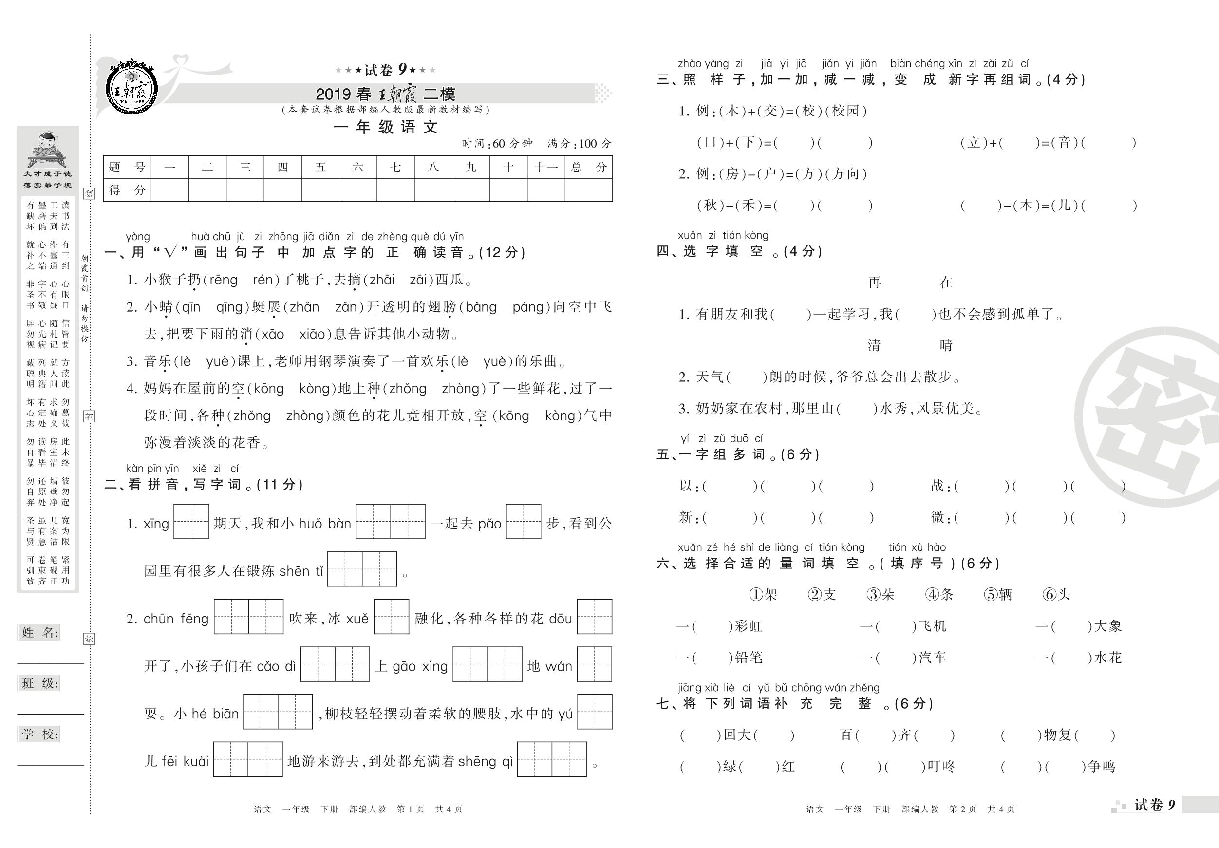 王朝霞期末模拟卷一年级下册语文(人教版)_R210731182632【9】