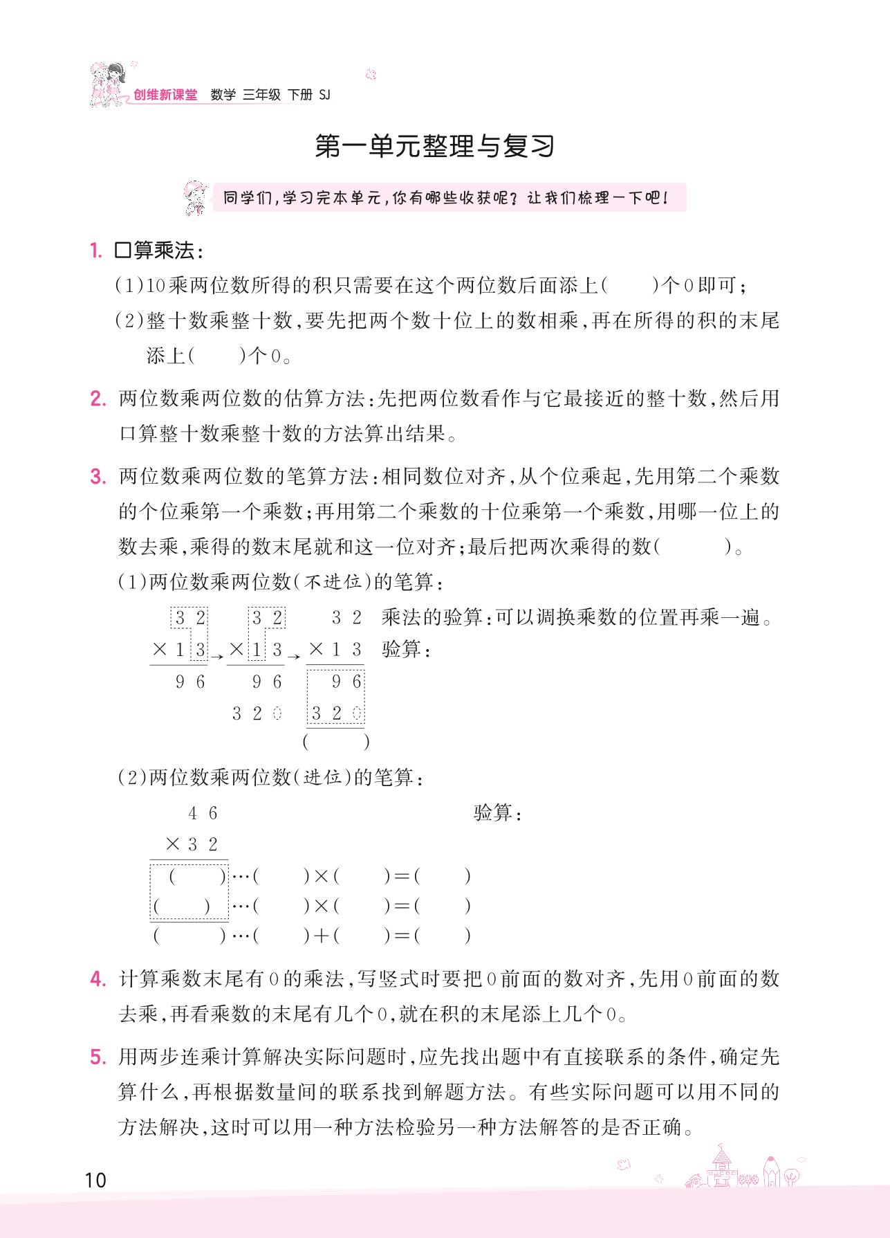 2022下册三年级数学苏教版 一 两位数乘两位数——第一单元整理与复习