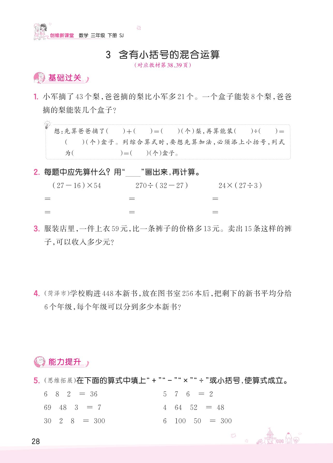 2022下册三年级数学苏教版 四 混合运算——3 含有小括号的混合运算
