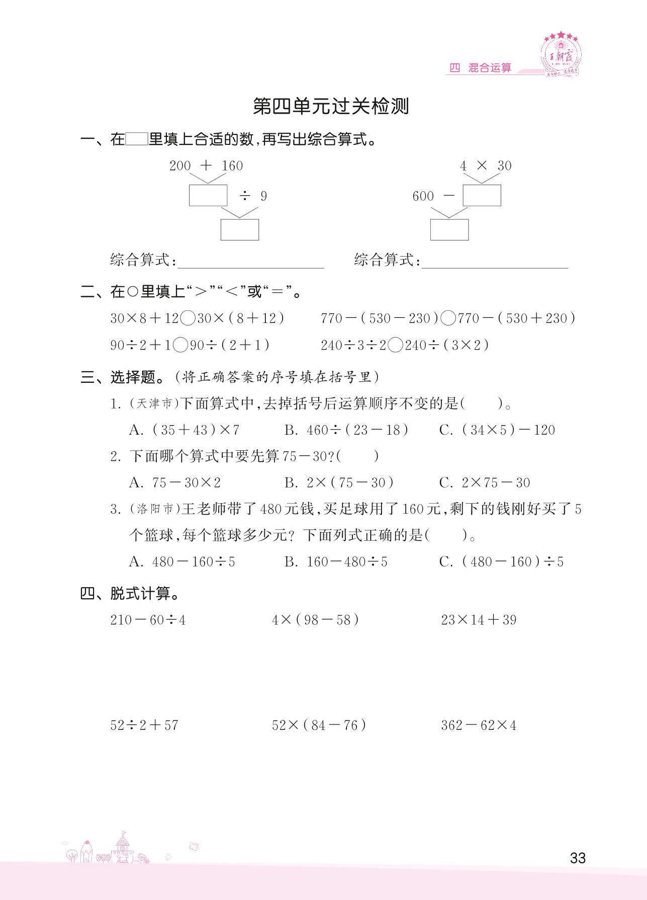 2022下册三年级数学苏教版 四 混合运算——第四单元过关检测