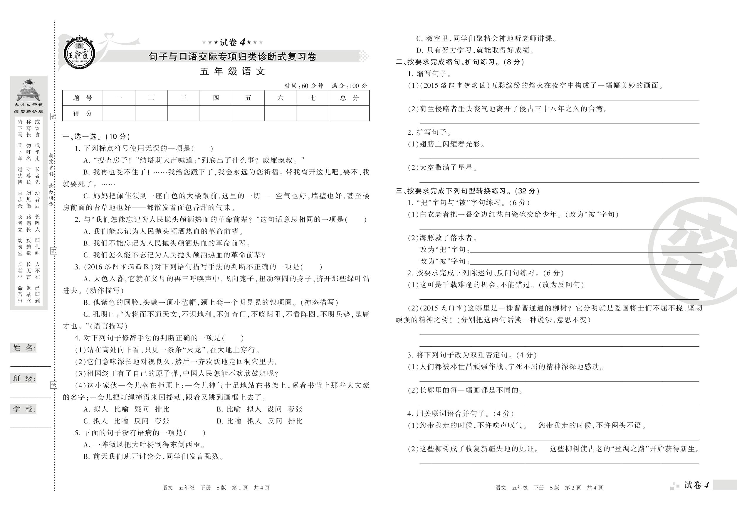 王朝霞期末专项卷——句子与口语交际专项归类诊断式复习卷五年级下册语文(S版)_R210801225634【4】