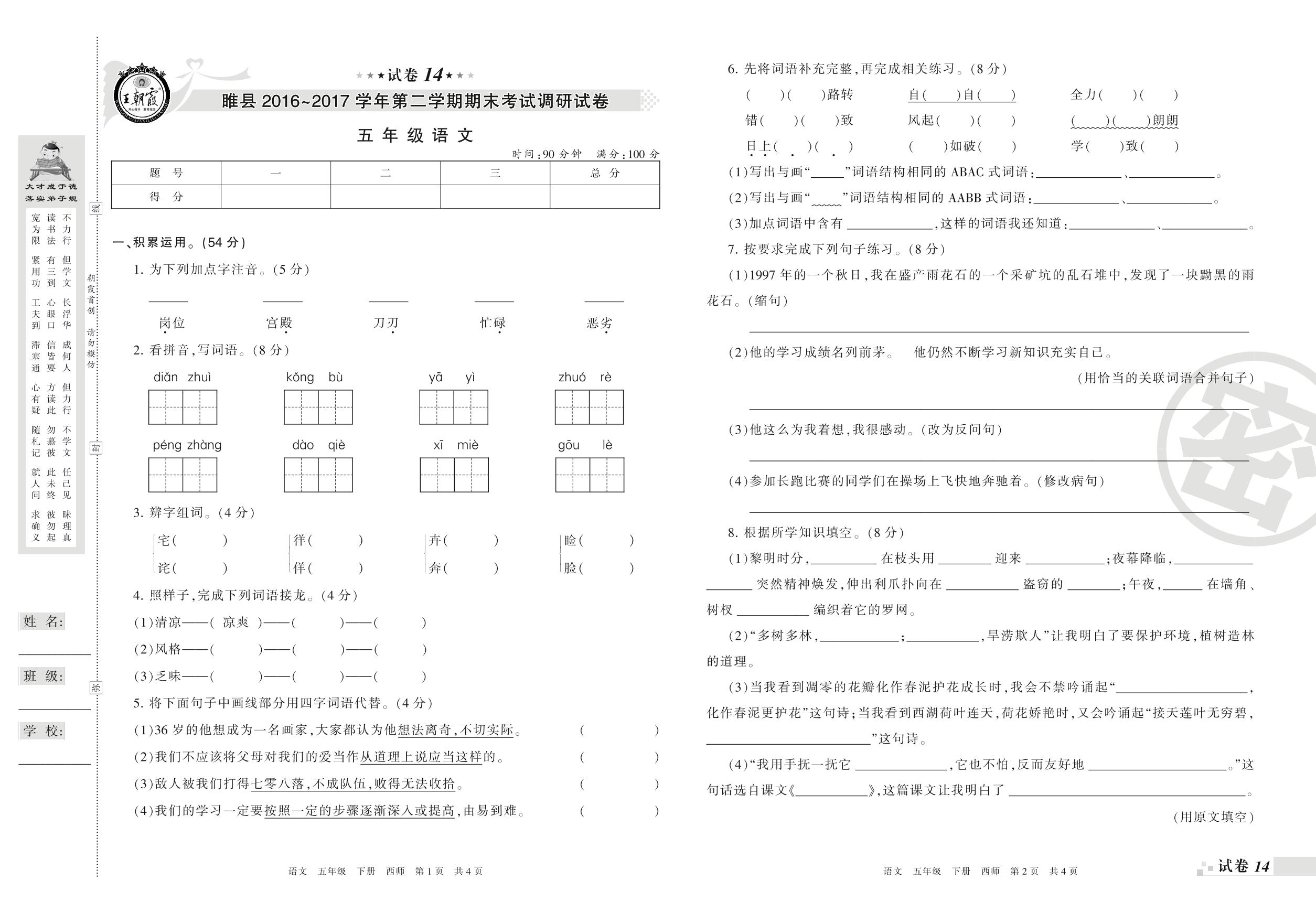 2016-2017学年第二学期商丘市睢县五年级语文试卷(西师版)【14】