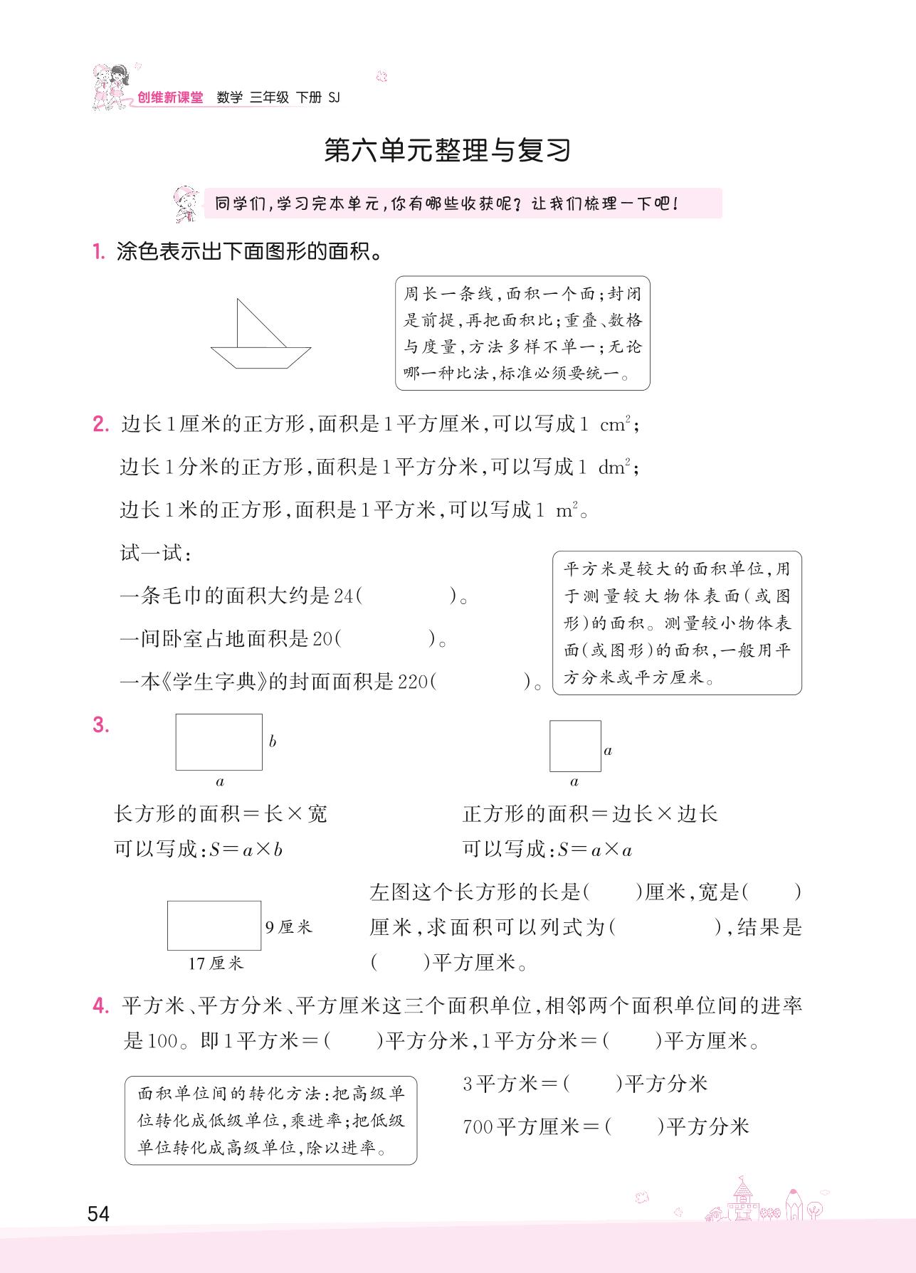 2022下册三年级数学苏教版 六 长方形和正方形的面积——第六单元整理与复习