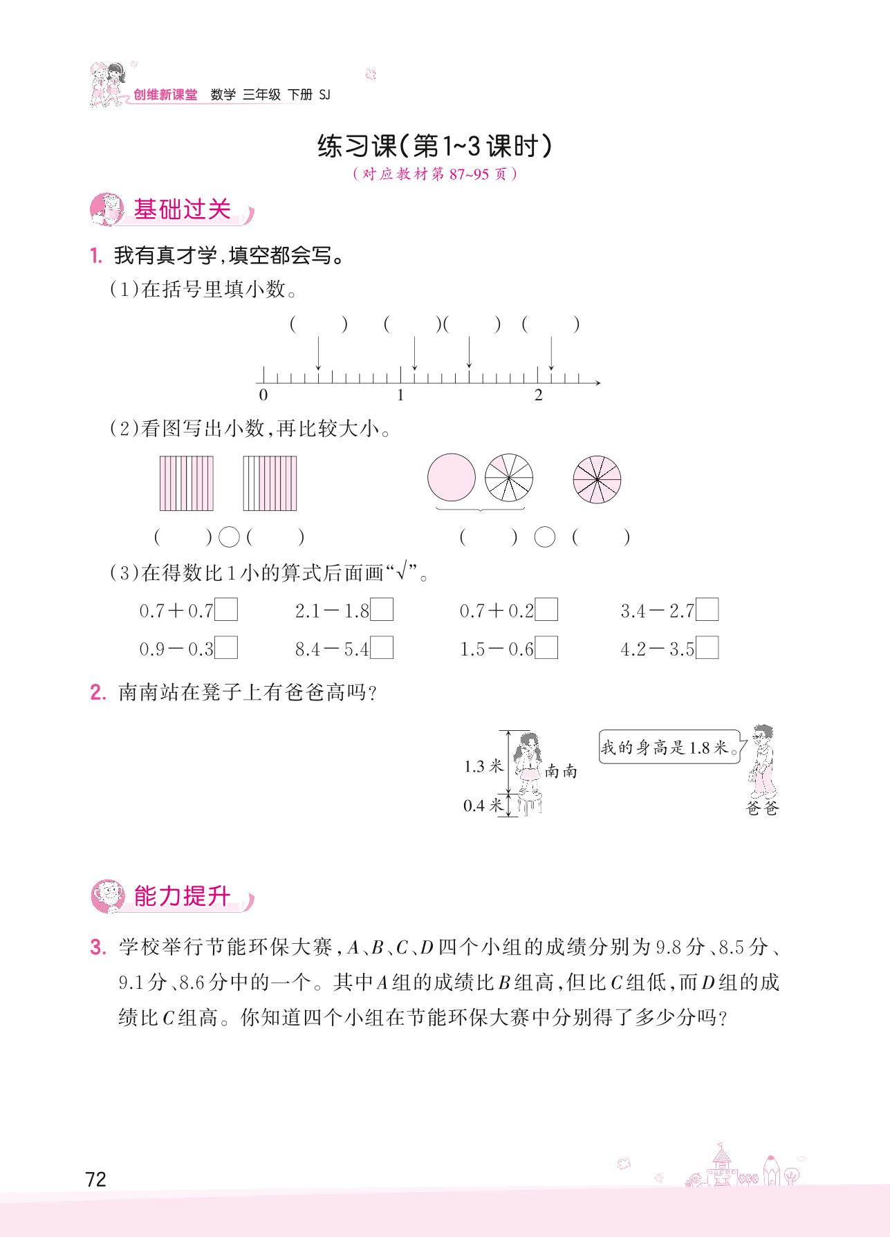 2022下册三年级数学苏教版 八 小数的初步认识——练习课(第1~3课时)