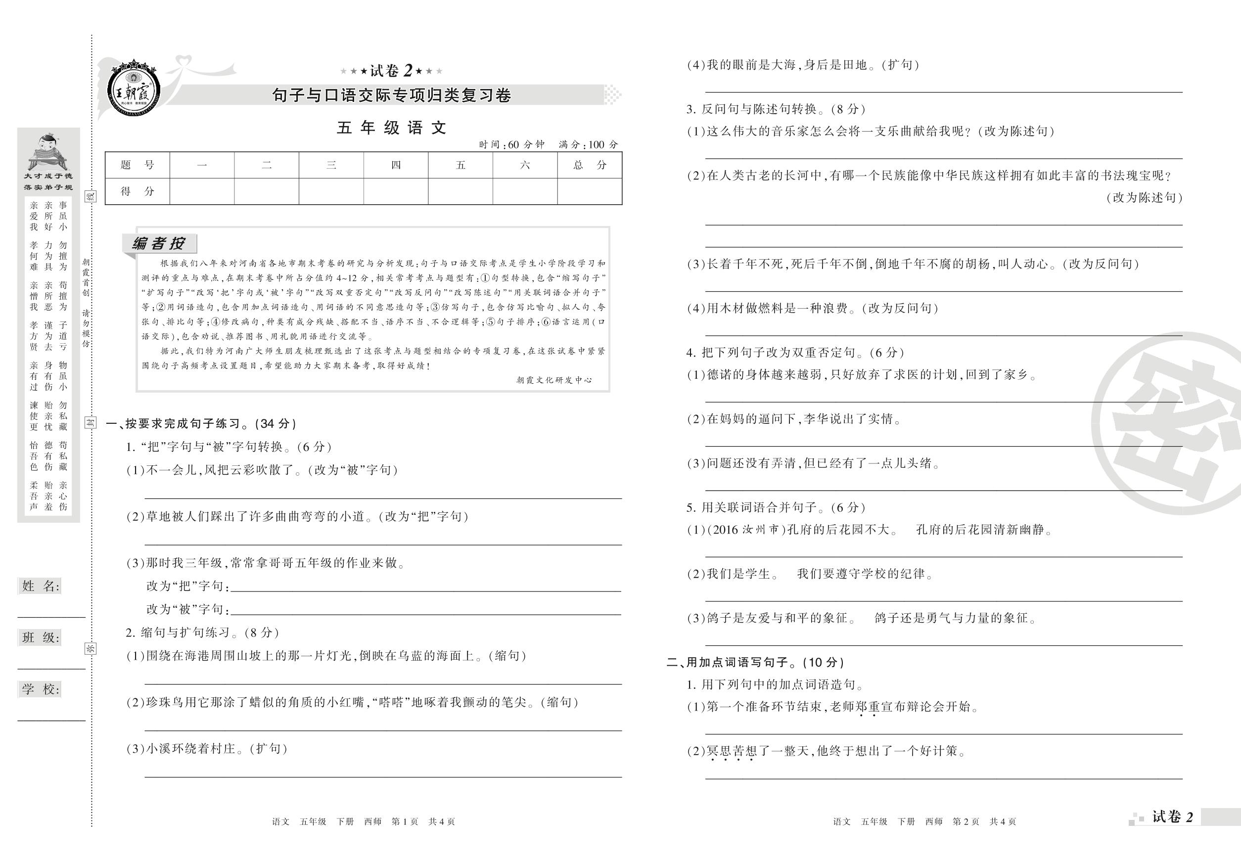 王朝霞期末专项卷——句子与口语交际专项归类复习卷五年级下册语文(西师版)_R210801225644【2】